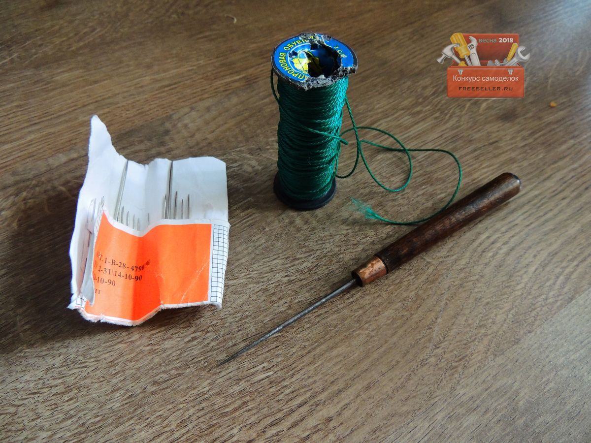 Далее взял капроновую нитку, шило и принялся сшивать сумки воедино, так чтобы они образовали квадрат.![]()