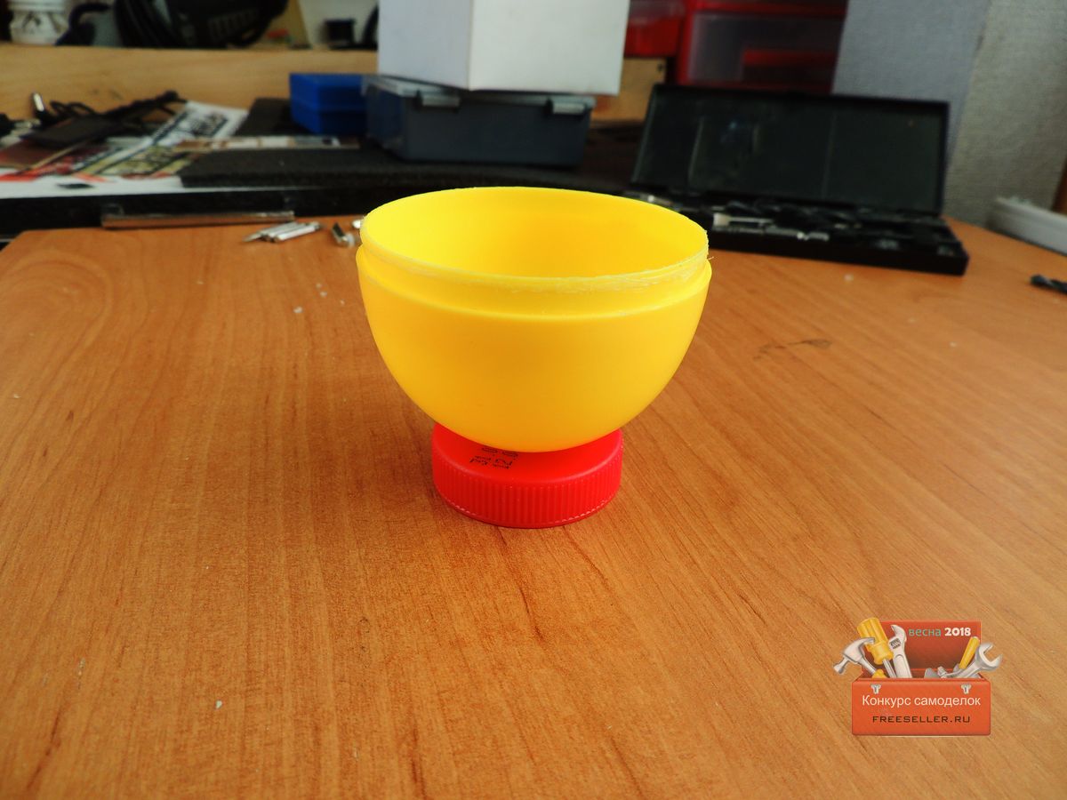 Далее принялся делать подставку для яйца, так как оно очень не устойчиво, для этого взял крышку от молока и соединил с нижней частью яйца.![]()