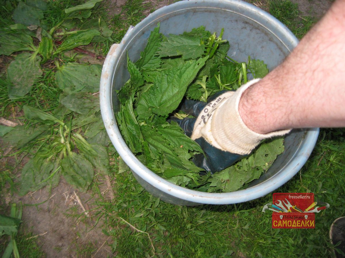 Однако мне пока много не надо, поэтому я взял старое пластиковое ведро емкостью 12 литров. Чистый выход настоя из него получится примерно около 10-11 литров. Как раз хватит на десять садовых поливанов.
