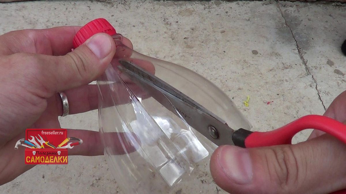 Первым делом обрезаем пластиковые бутылки примерно чуть выше половины, при помощи ножниц делаем поперечные разрезы почти до самого горлышка, а так же отрезаем горлышко, вообщем так, как на фото ниже.