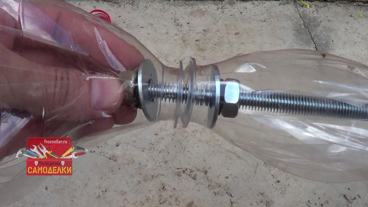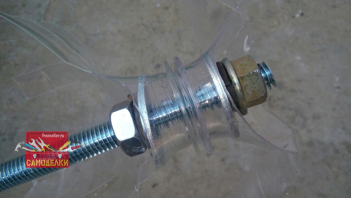 Затем берем шпильку, накручиваем на нее гайку с шайбой, одеваем одну из обрезанных бутылок, далее одеваем вторую и все это затягиваем при помощи второй гайки. Немного "распушиваем" лепестки от бутылки и наша самоделка готова!