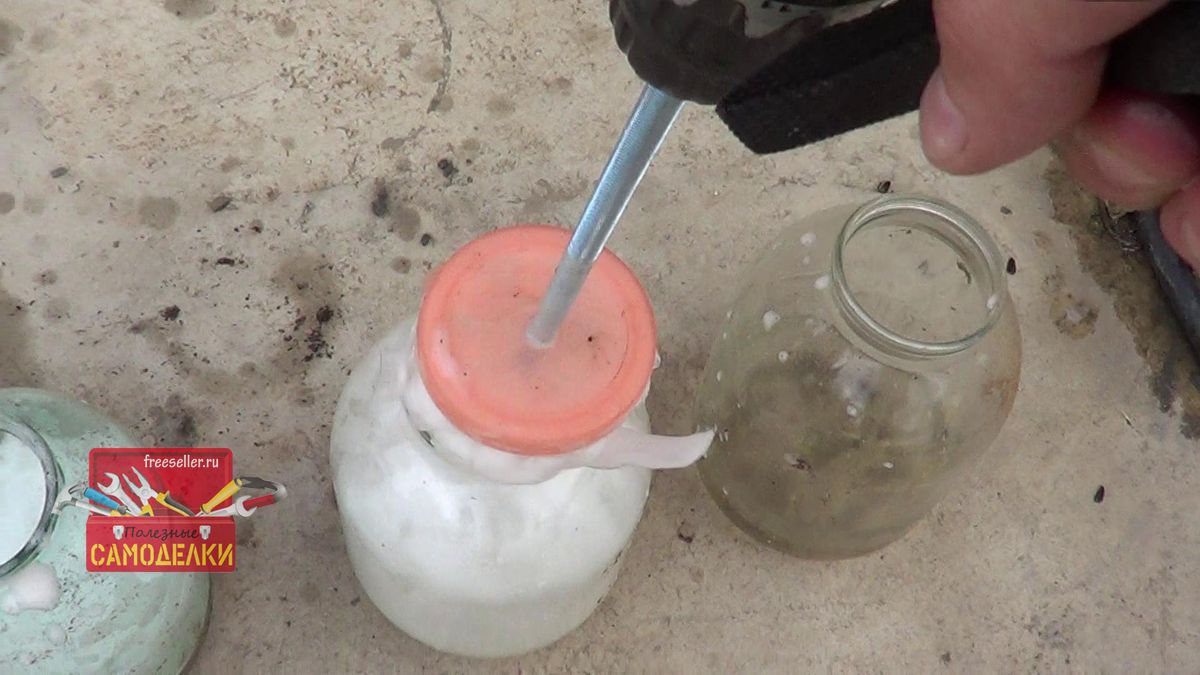 Теперь нужно взять обычную крышку от банки и проделать посередине сквозное отверстие, что бы в нем свободно проходила шпилька.
