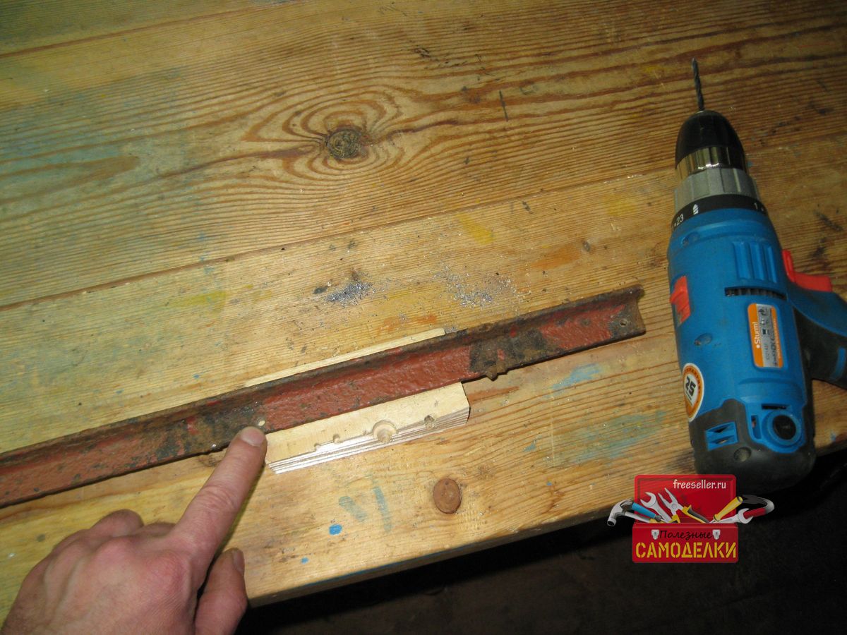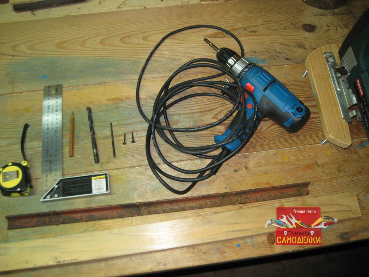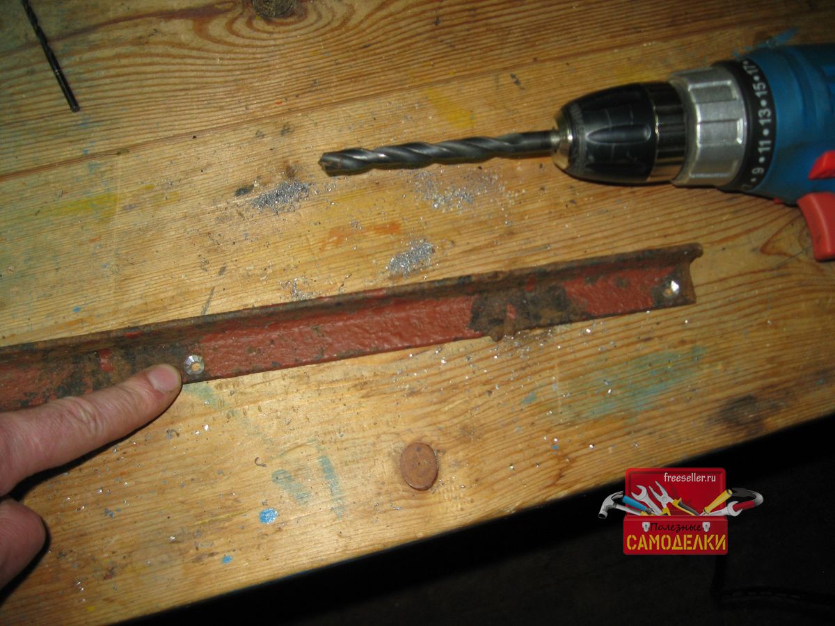 Далее, сверлим в стальном уголке два сквозных отверстия диаметром 4 мм. Одно отверстие делаем на самом конце уголка, а другое примерно через 20 см.