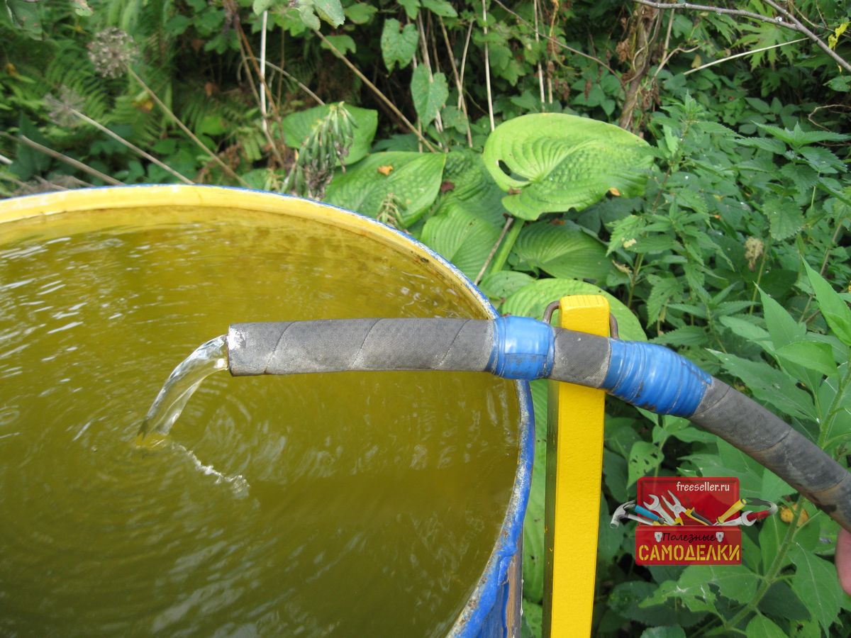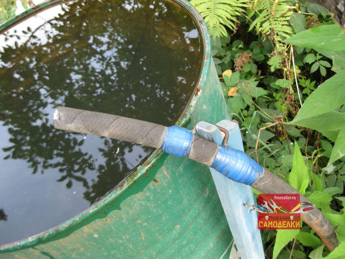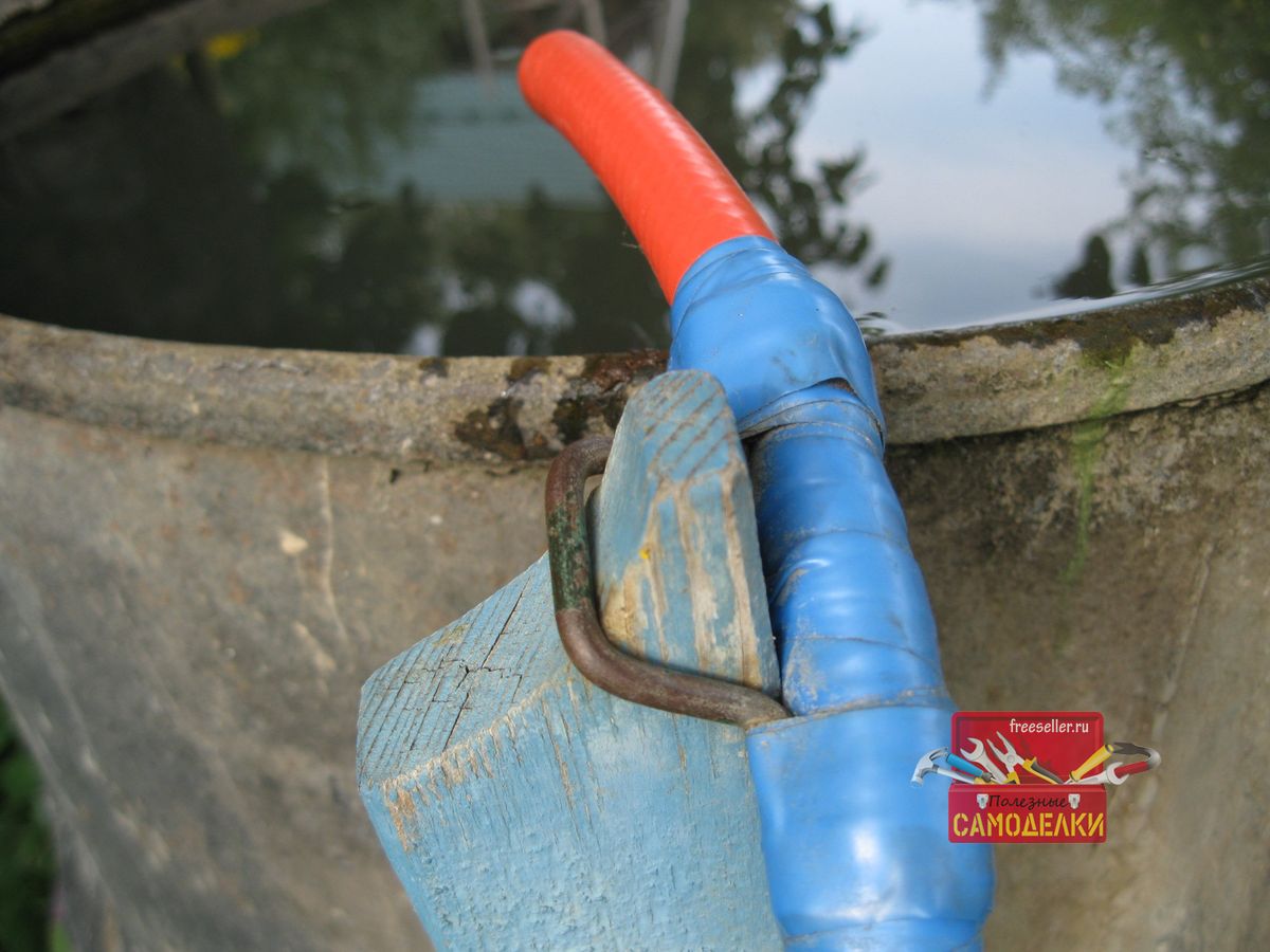 Для решения этой проблемы, конец шланга, опущенный в бочку, часто прижимают какими-нибудь досками или же просто опускают его поглубже до самого дна бочки. Однако такие меры зачастую весьма неудобны, да и не дают полной гарантии, что шланг не выскочит из бочки.