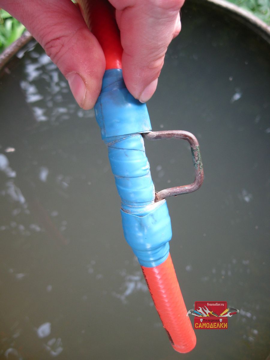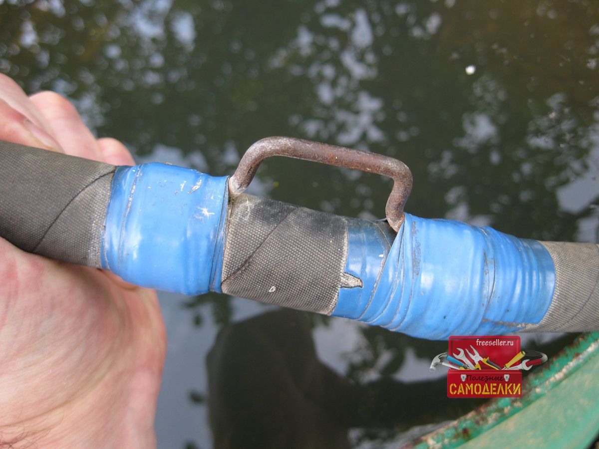 Такая скоба делается из толстой нержавеющей проволоки и прикручивается к шлангу при помощи изоляционной ленты.