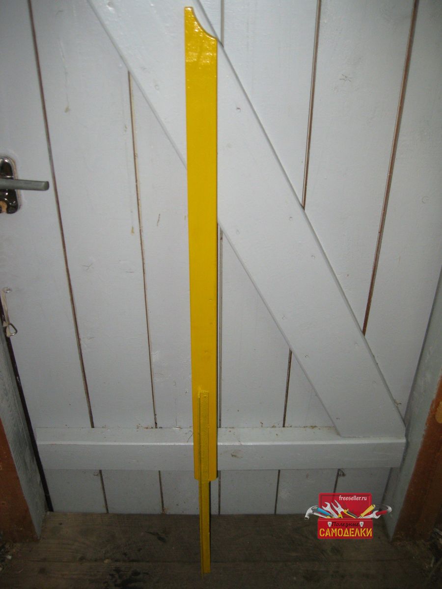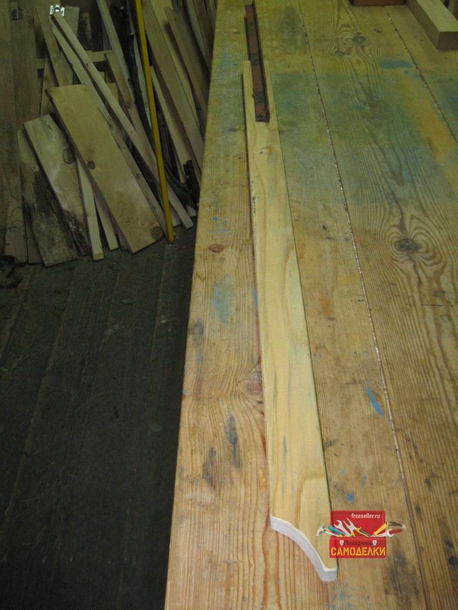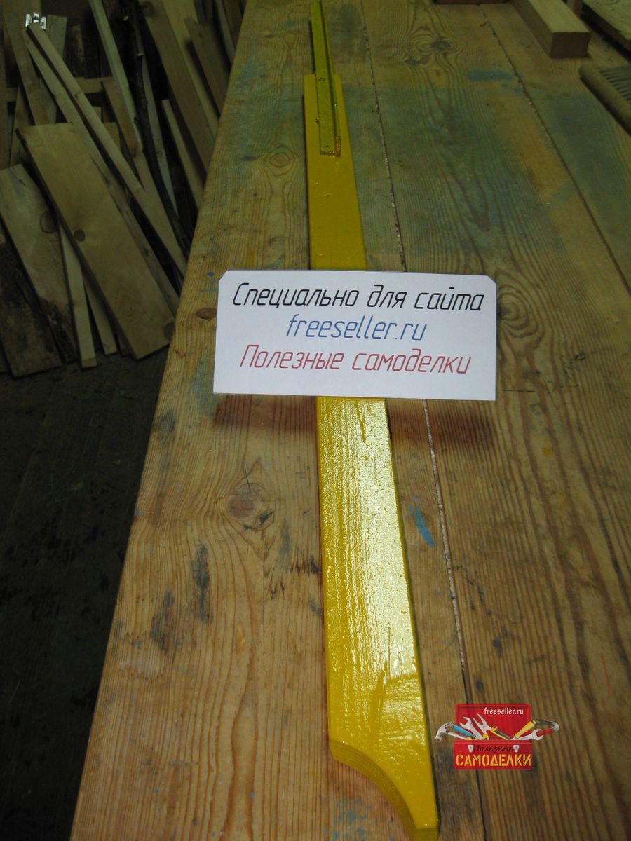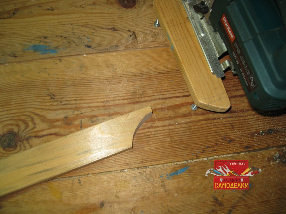 Сначала отпиливаем дощечку необходимой длины, а на одном из ее концов, делаем вот такой изогнутый спил для надевания проволочной скобы шланга.