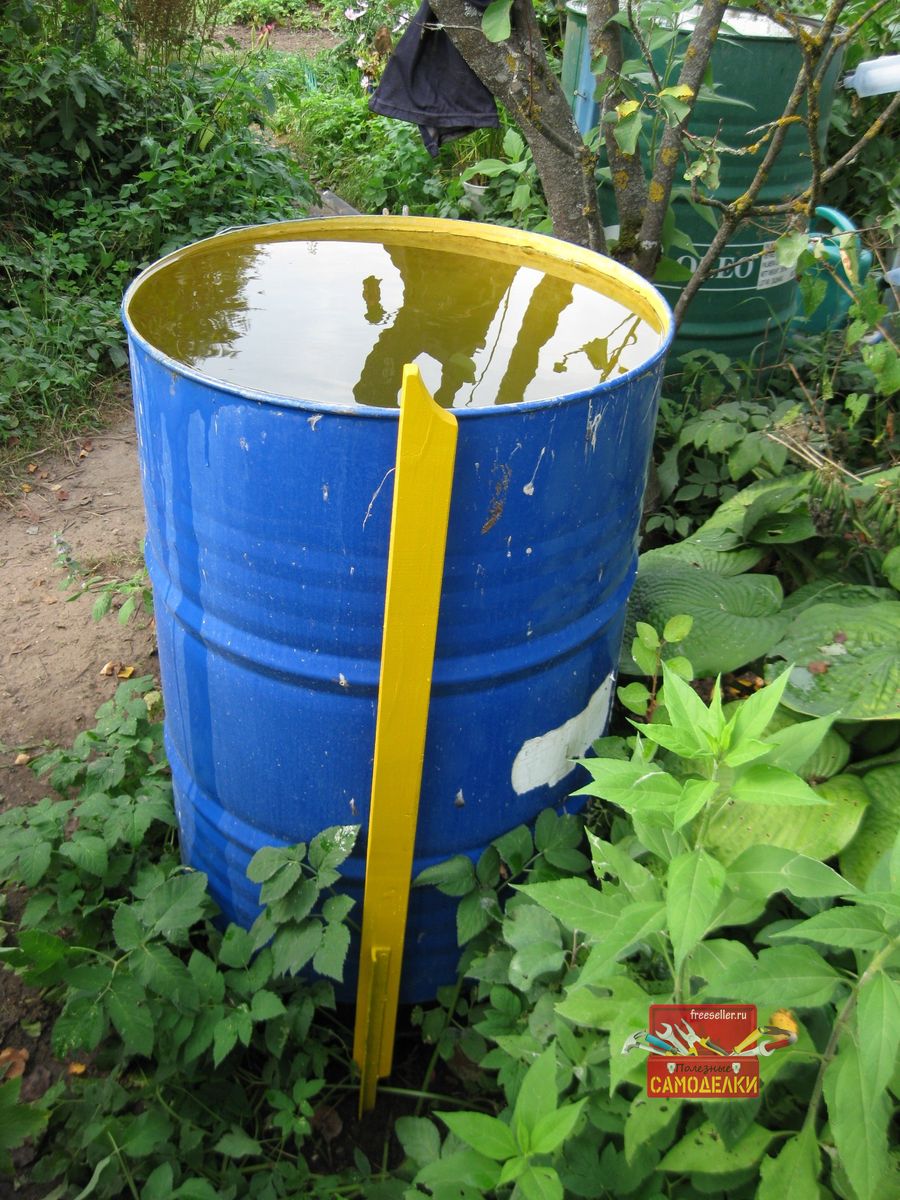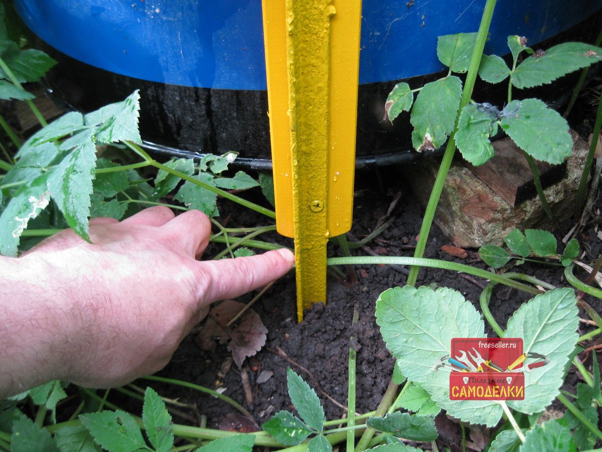 Теперь осталось установить его рядом с бочкой, воткнув в землю уголок.