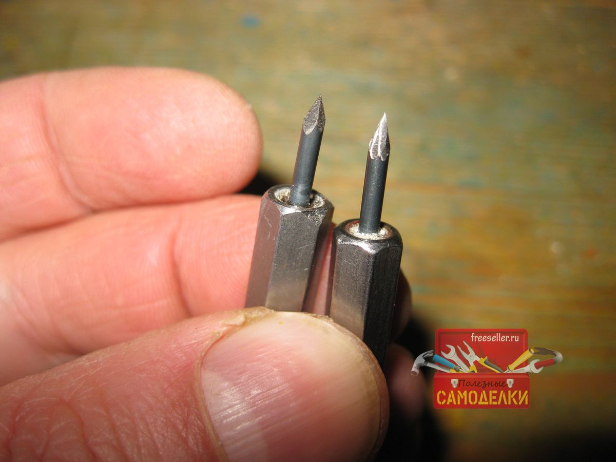 Из биты с небольшим сломанным сверлом, очень легко можно сделать инструмент, который будет являться одновременно и шилом и сверлом для древесины и других мягких материалов.