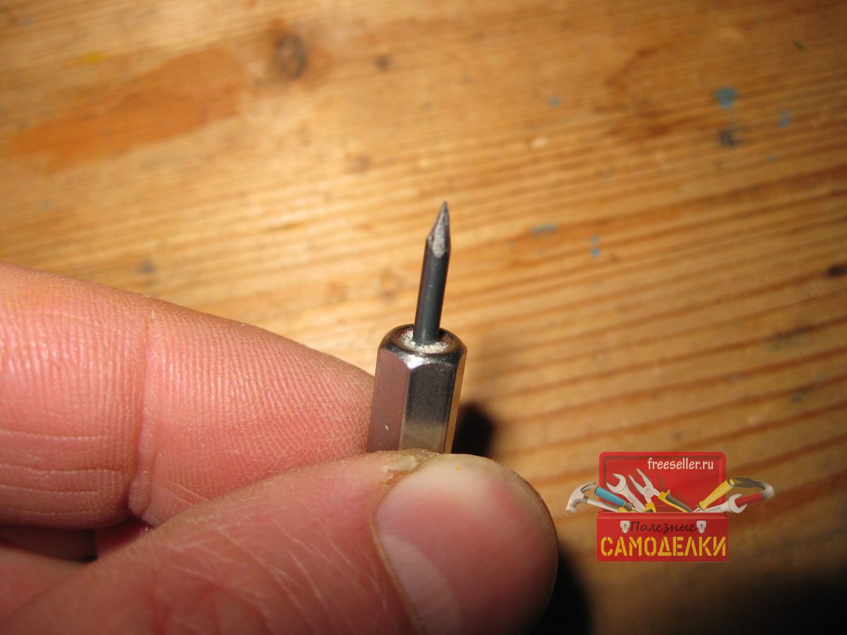 Причем особенное удобство такого шила, заключается в том, что для него не нужна самостоятельная рукоятка, поскольку для работы, его достаточно вставить в отвертку как обычную биту и можно накалывать отверстия в деревянных заготовках.![]()