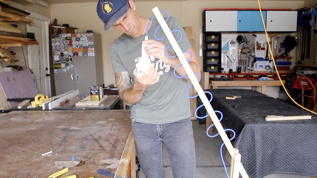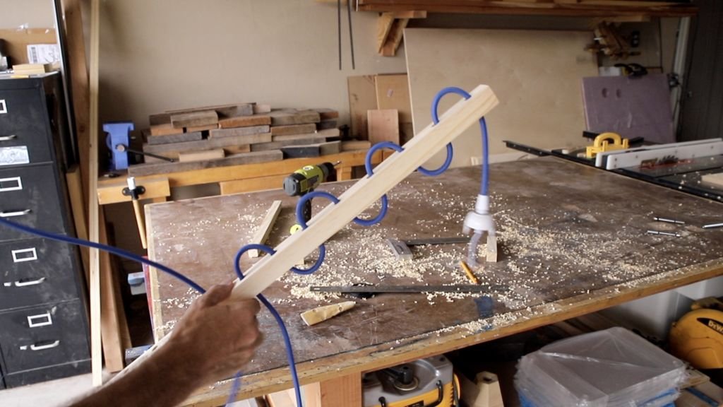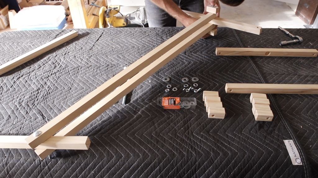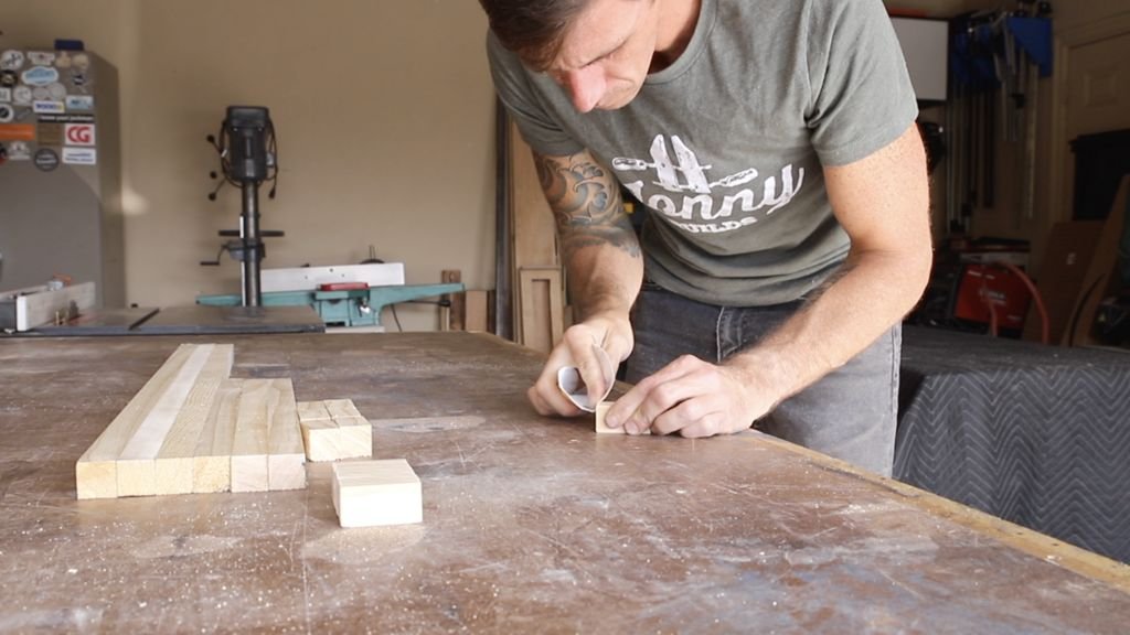 Каркас светильника состоит из 3 брусков длиной 60 см, 3 брусков по 45 см и 10 брусков по 5 см. Отпиливаем детали и шлифуем края наждачкой.