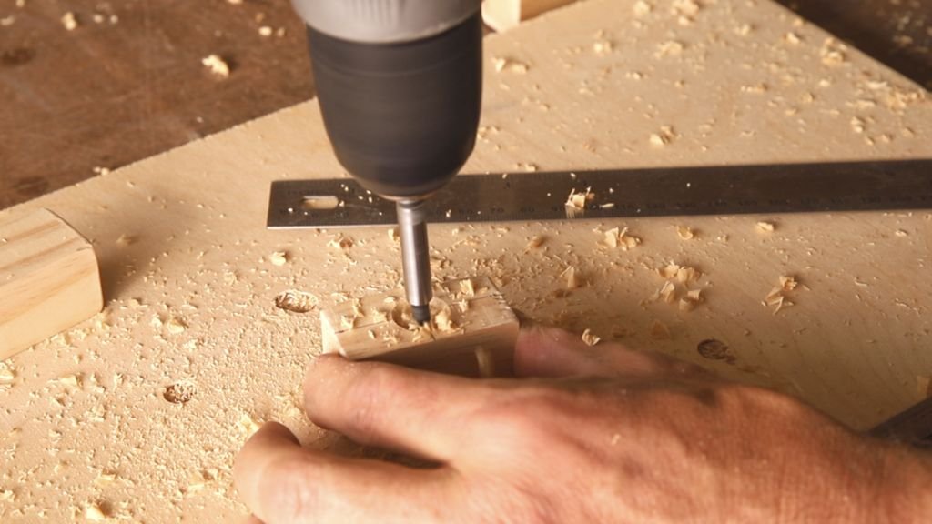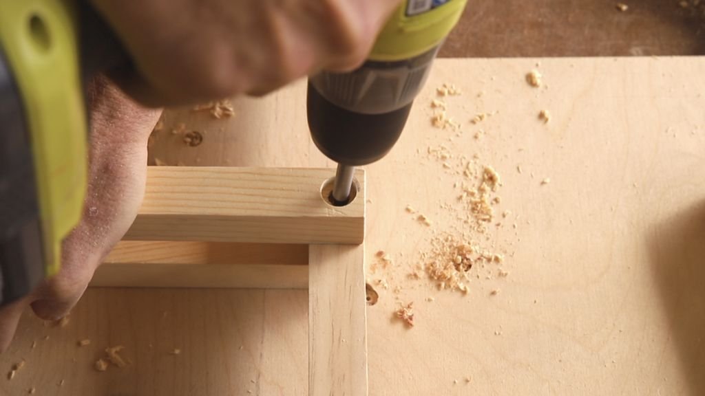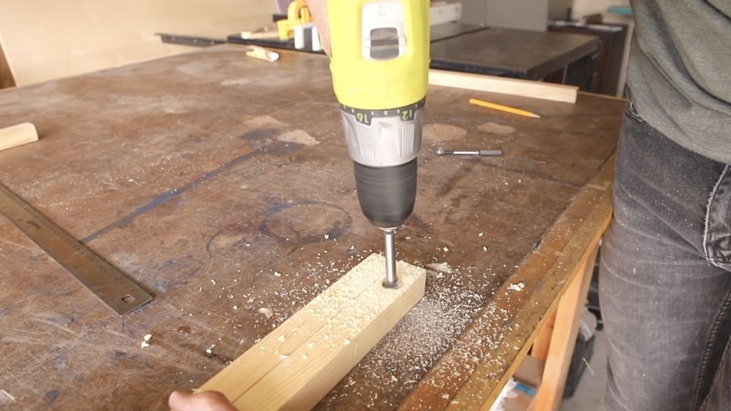 Сверлим отверстия в вертикальных стойках. Отверстие в самой верхней стойке светильника должно быть смещено от центра.