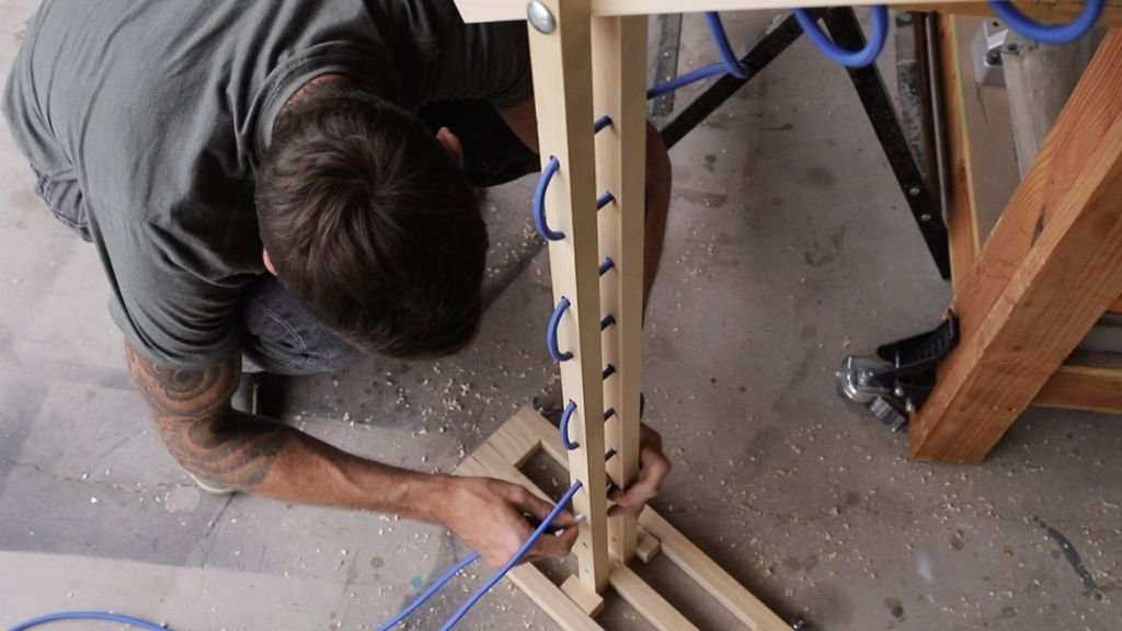 В вертикальном каркасе через каждые 5 см сверлим отверстия для провода. Края отверстий шлифуем наждачкой.