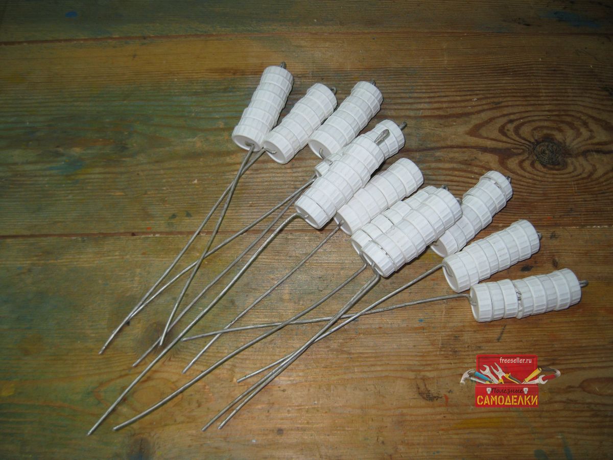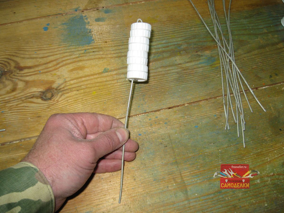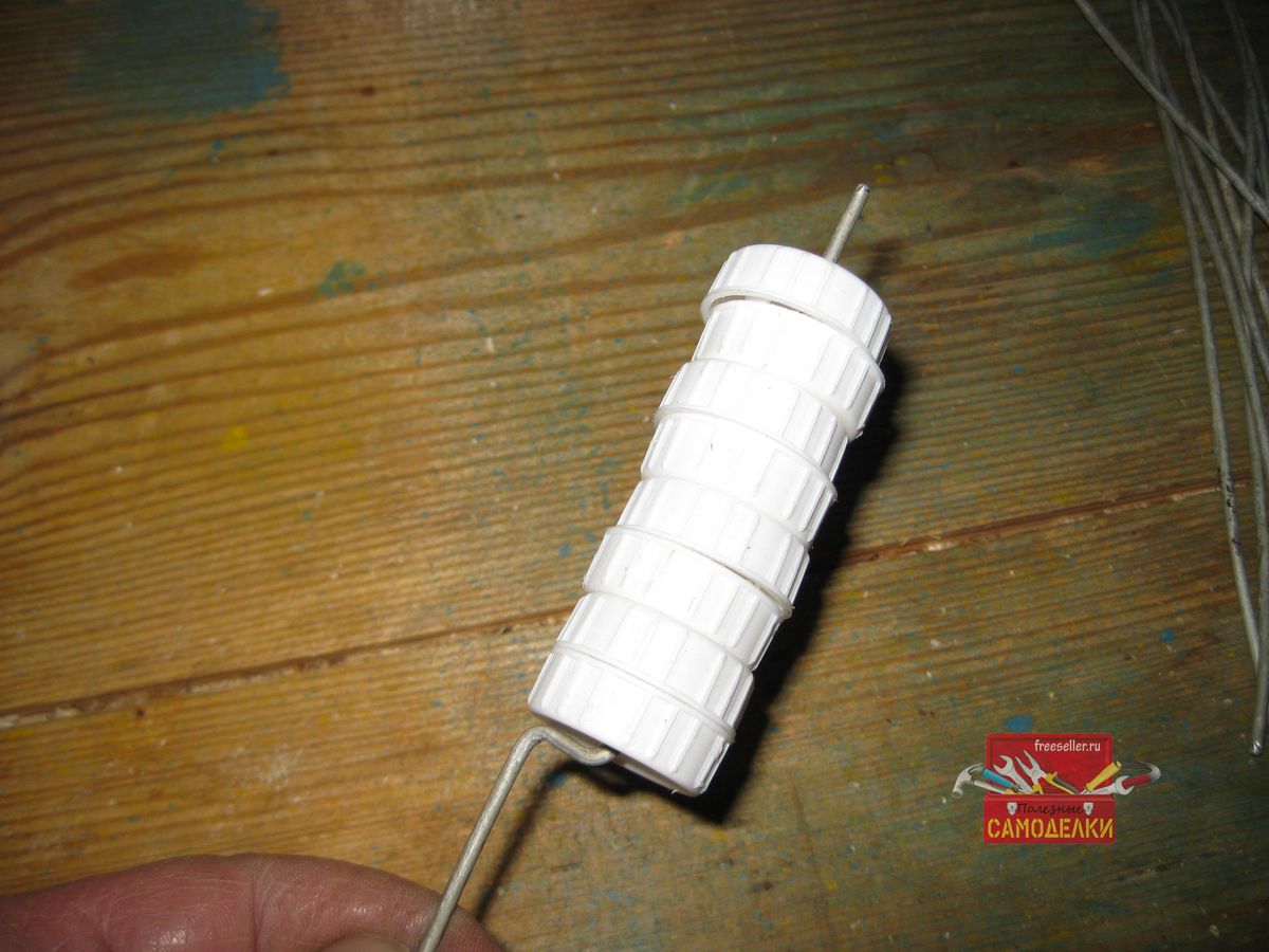 А после этого, стал попарно (нижними сторонами друг к другу), надевать пластиковые крышки на верхние части отрезков проволоки.![]()