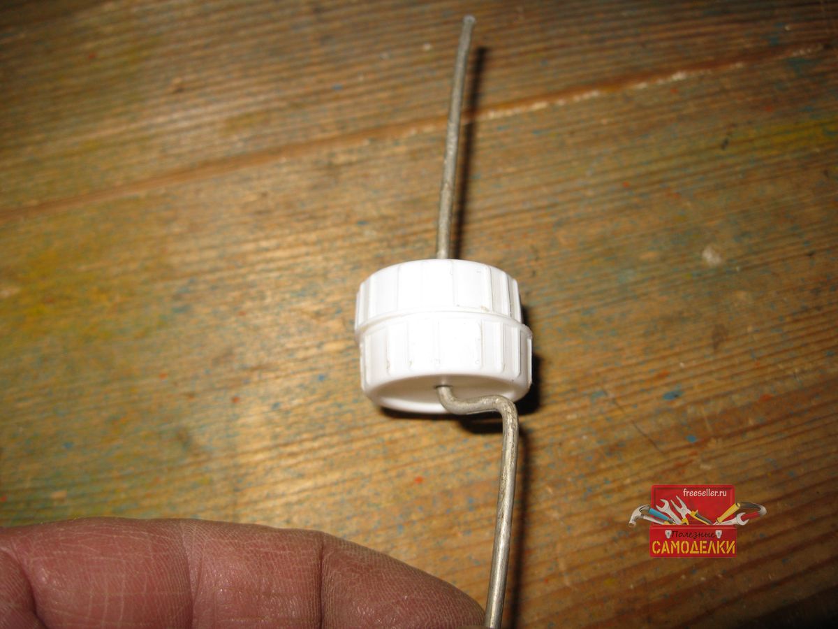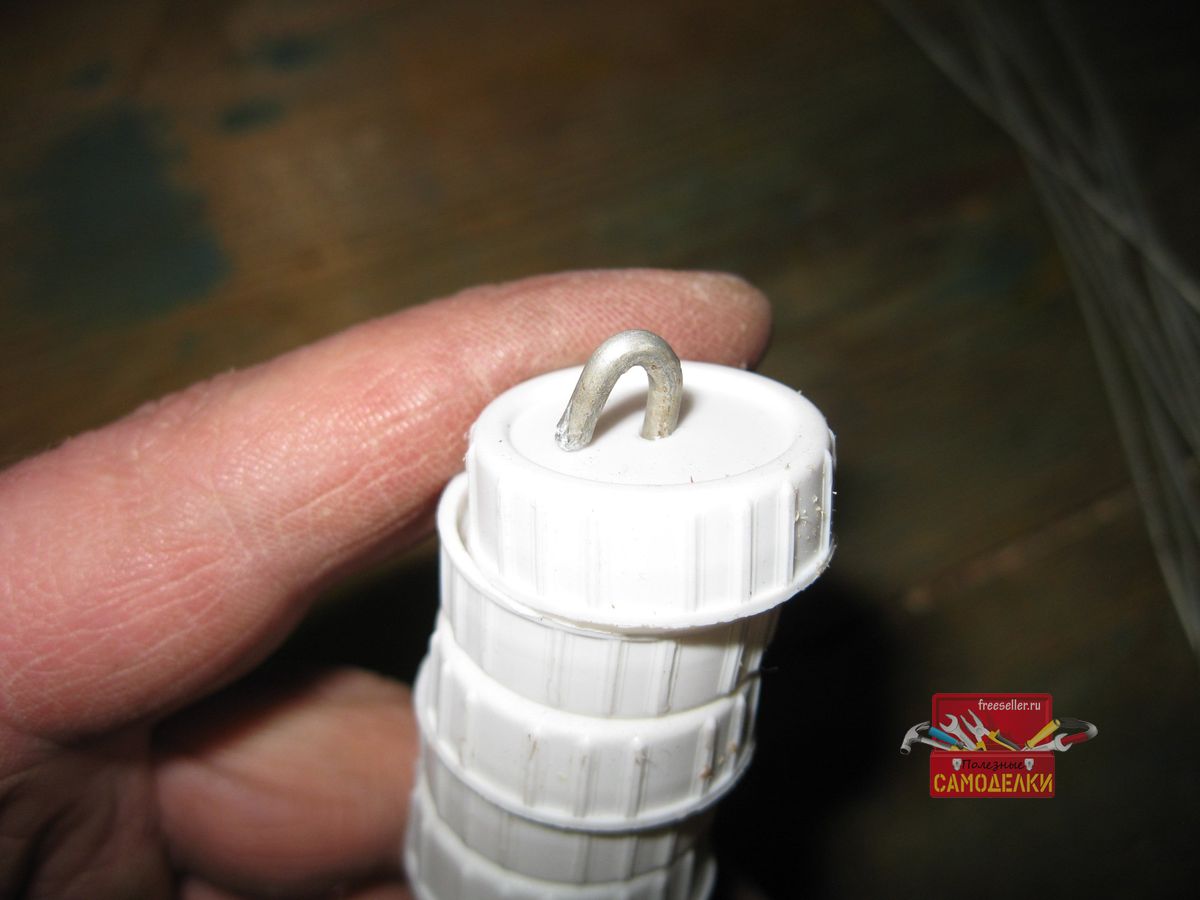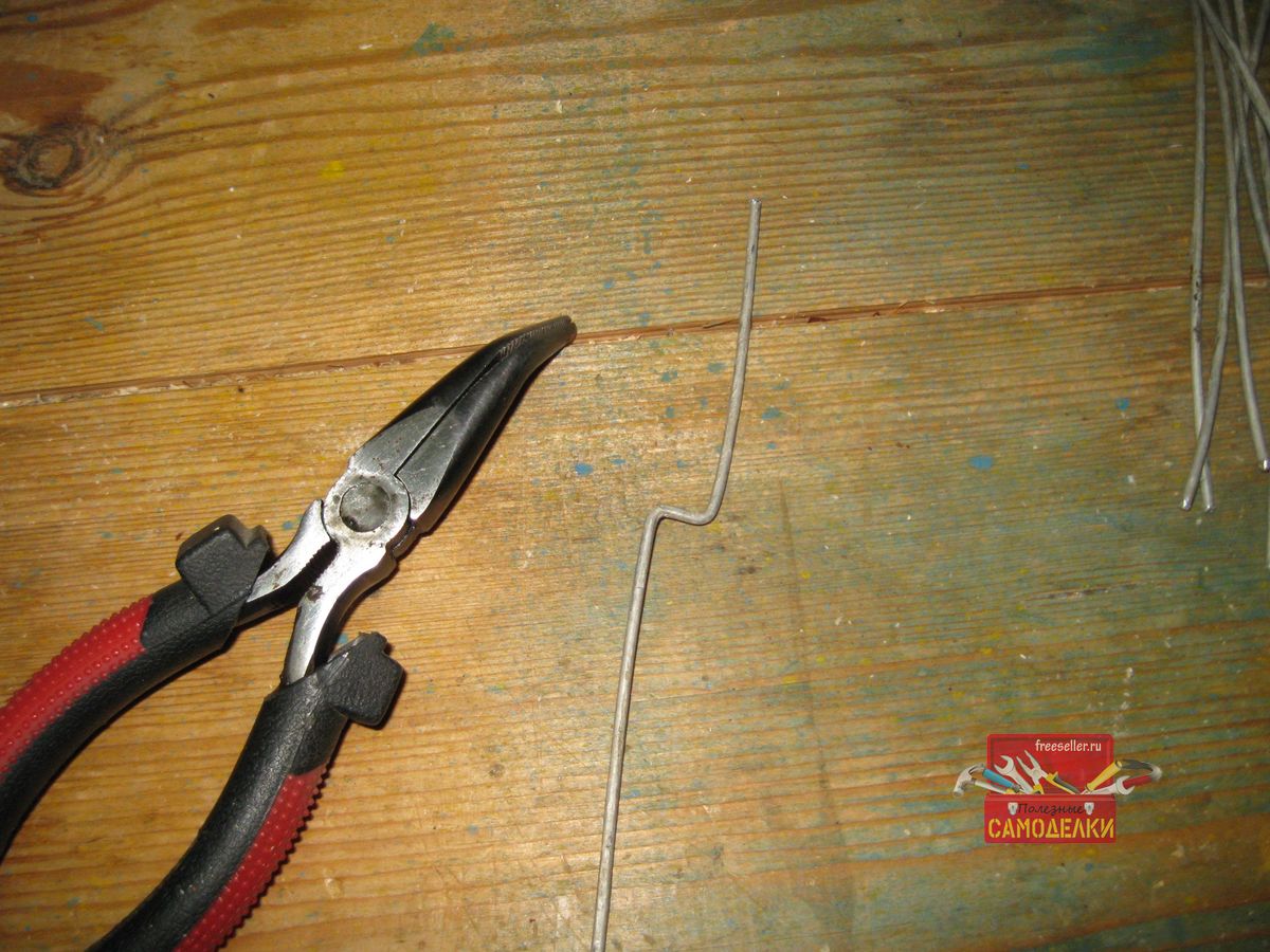 Затем при помощи длинногубцев, сделал на каждом отрезке проволоки вот такой изгиб, который будет служить стопором для пластиковых крышек.![]()