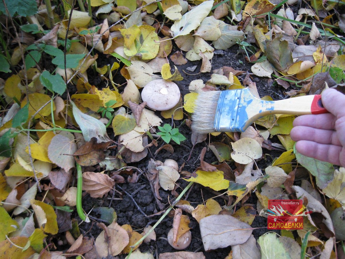 Теперь можно пометить этими колышками месторождения грибов. Для этого, я сначала аккуратно расчистил опавшую листву над грибами обычной малярной кисточкой, чтобы точно определить местоположение грибов.![]()
