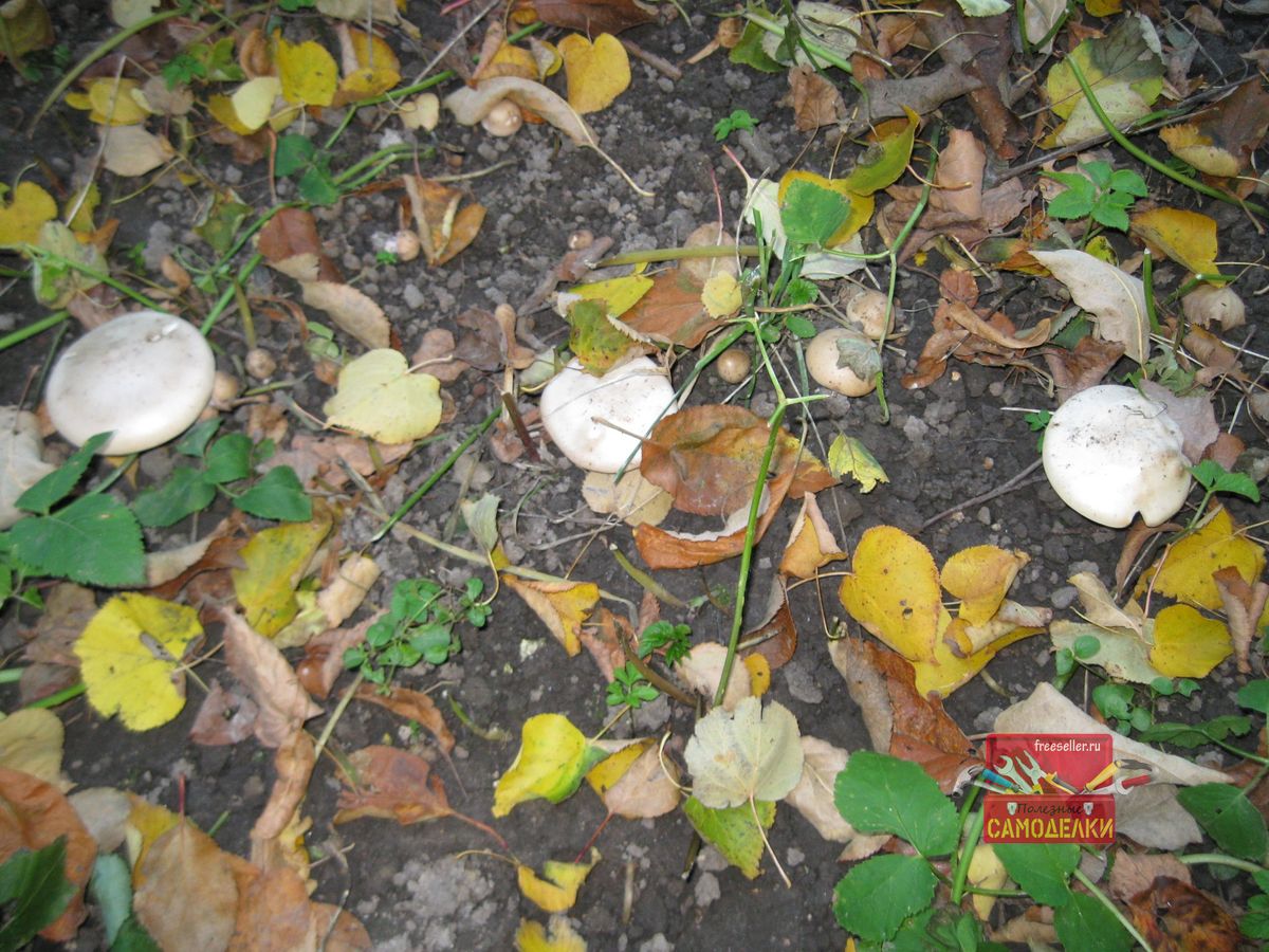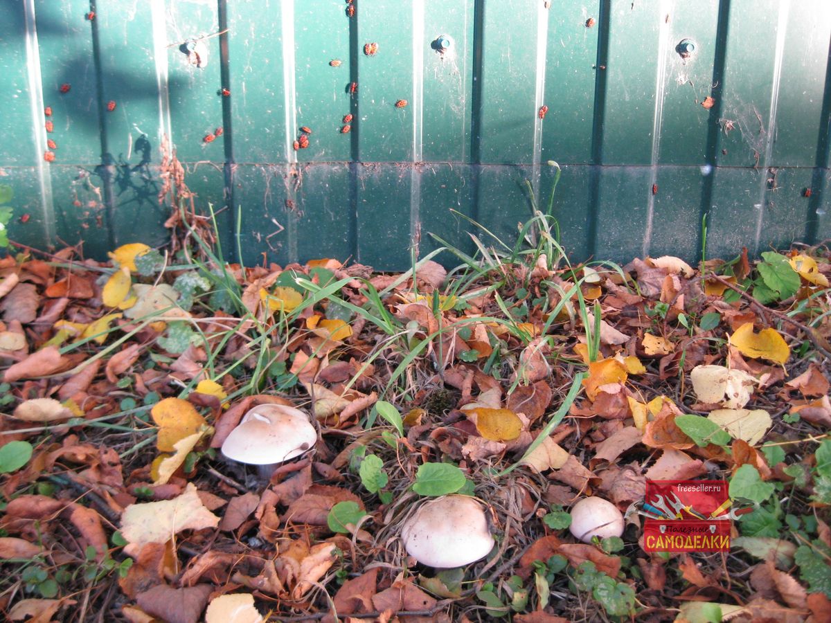 Растут эти грибы у нас в конце сада под плодовыми деревьями и кустарниками, а также и с улицы на территории, примыкающей к нашему участку. Вот, например, несколько этих грибов выросло на улице, рядом с нашим забором.![]()
