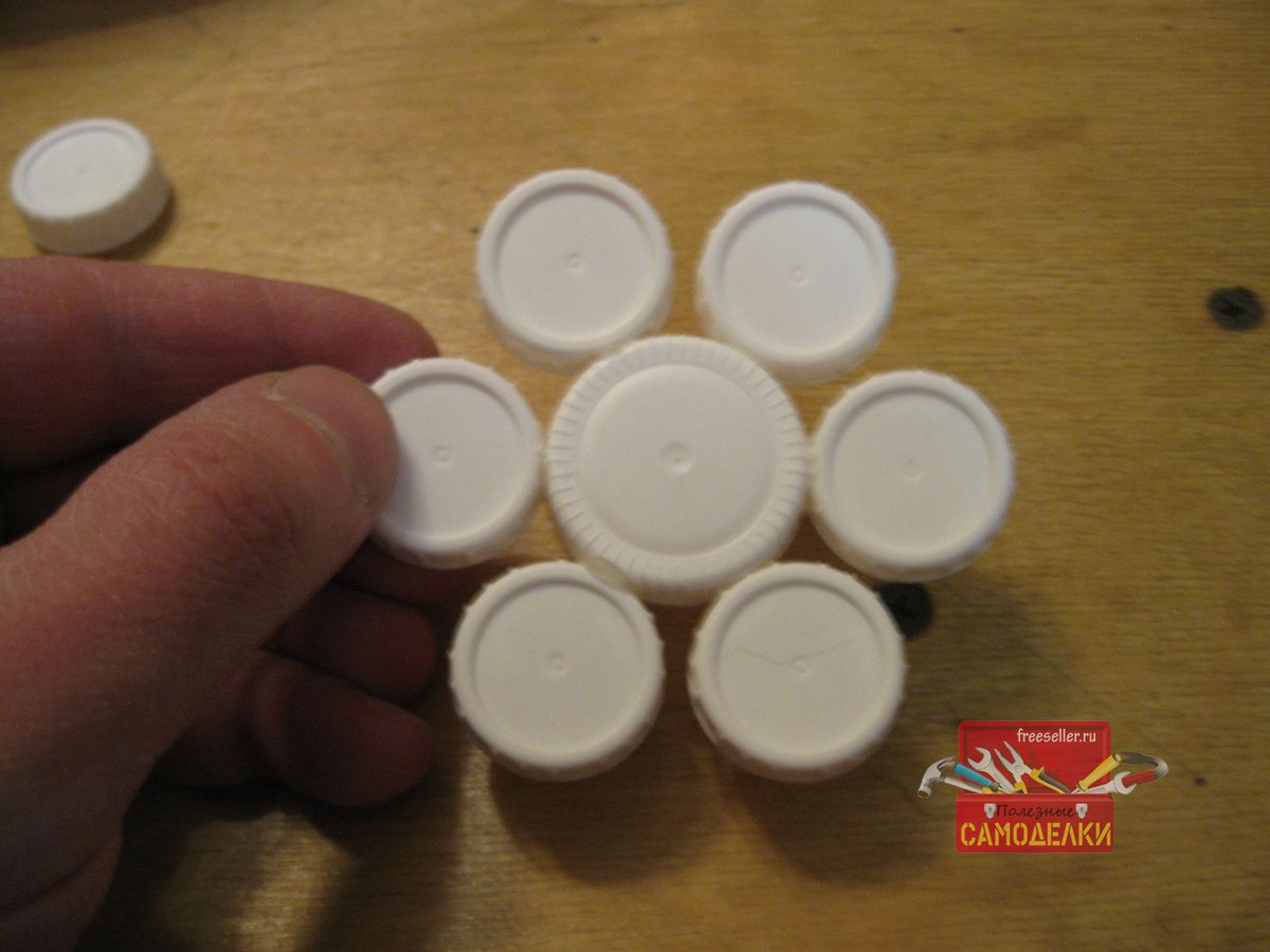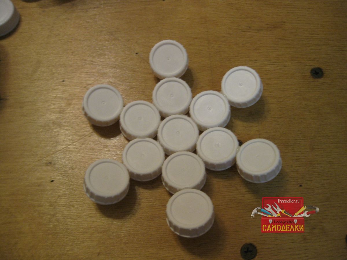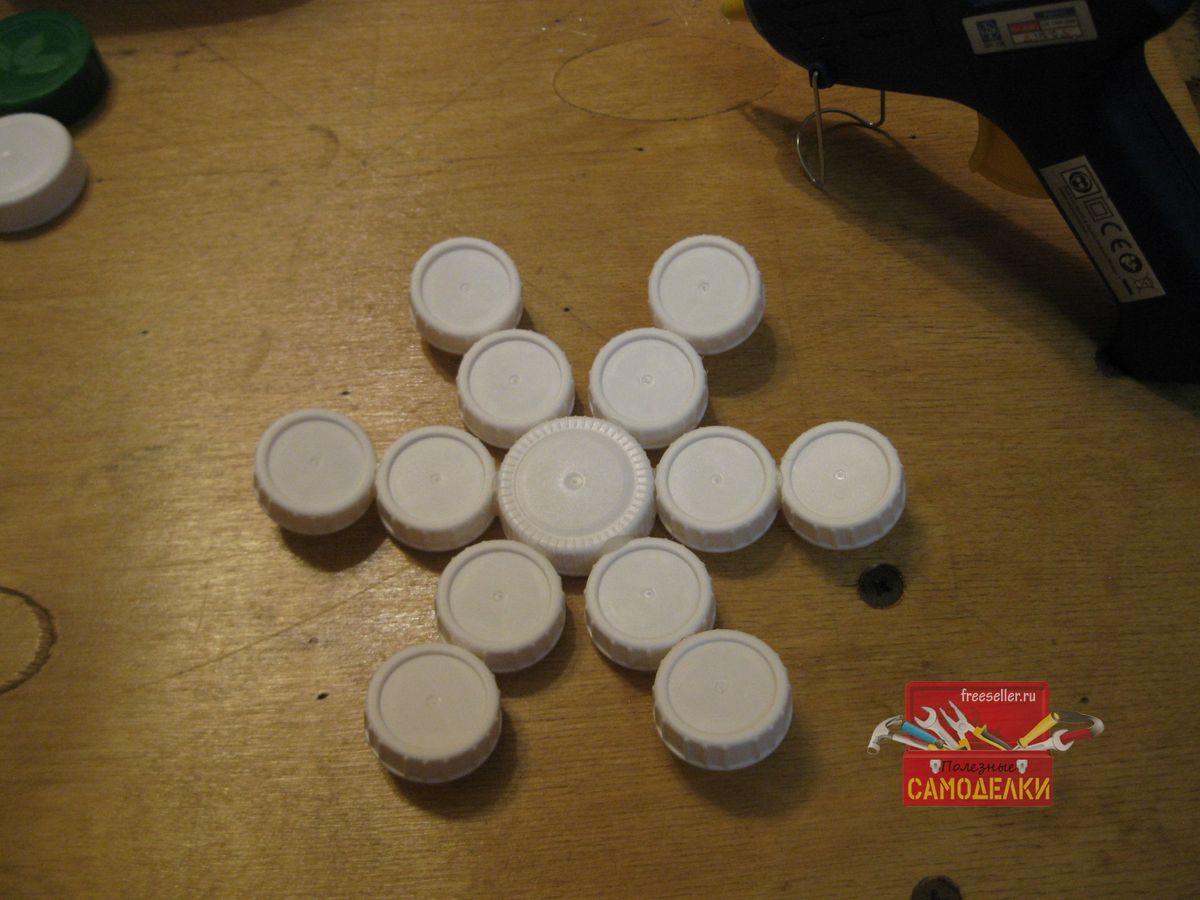 Прежде чем склеивать крышки между собой, желательно определится, какую фигуру, например, в виде снежинки мы будем склеивать и для этого предварительно разложить крышки на столе в виде этой фигуры.