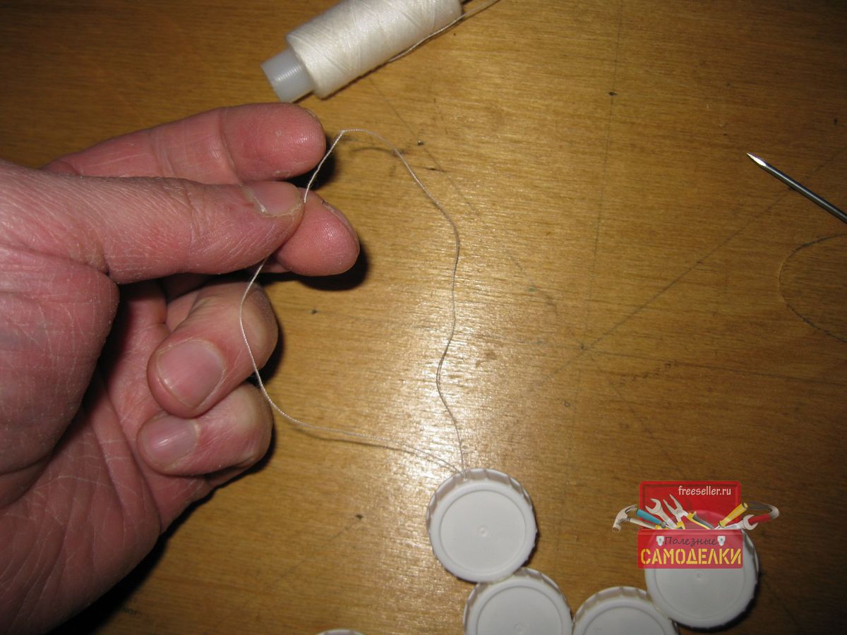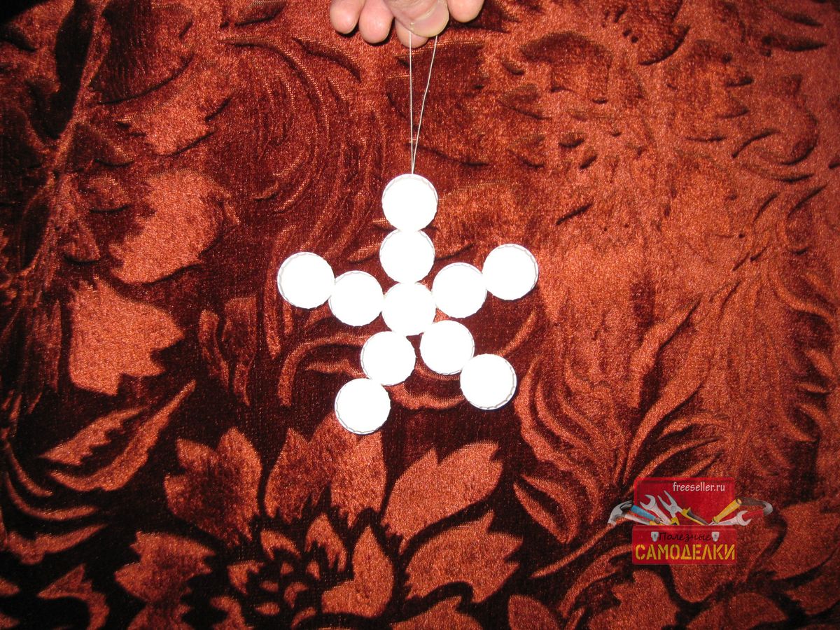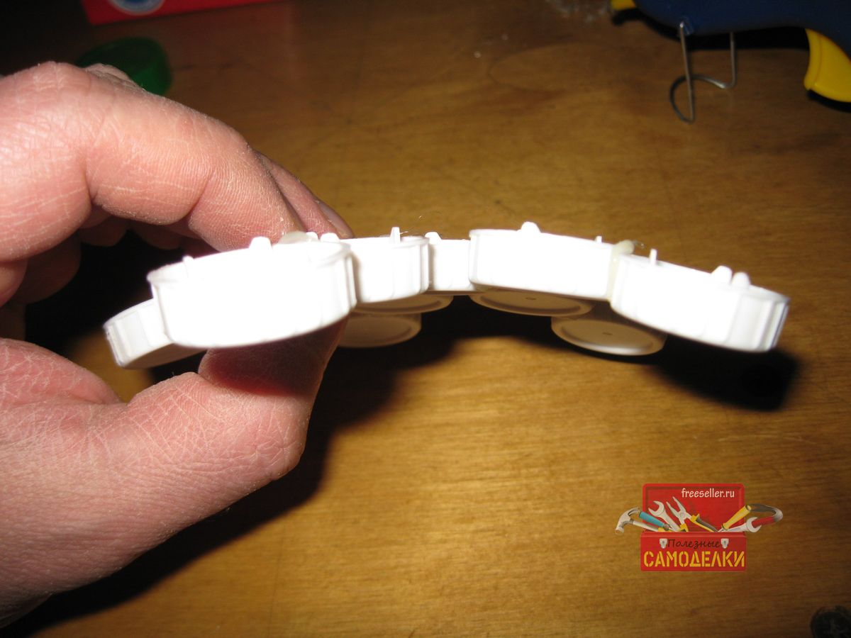 Прежде чем склеивать крышки между собой, желательно определится, какую фигуру, например, в виде снежинки мы будем склеивать и для этого предварительно разложить крышки на столе в виде этой фигуры.