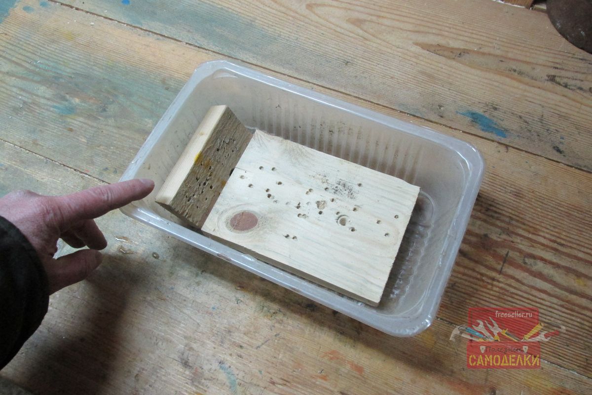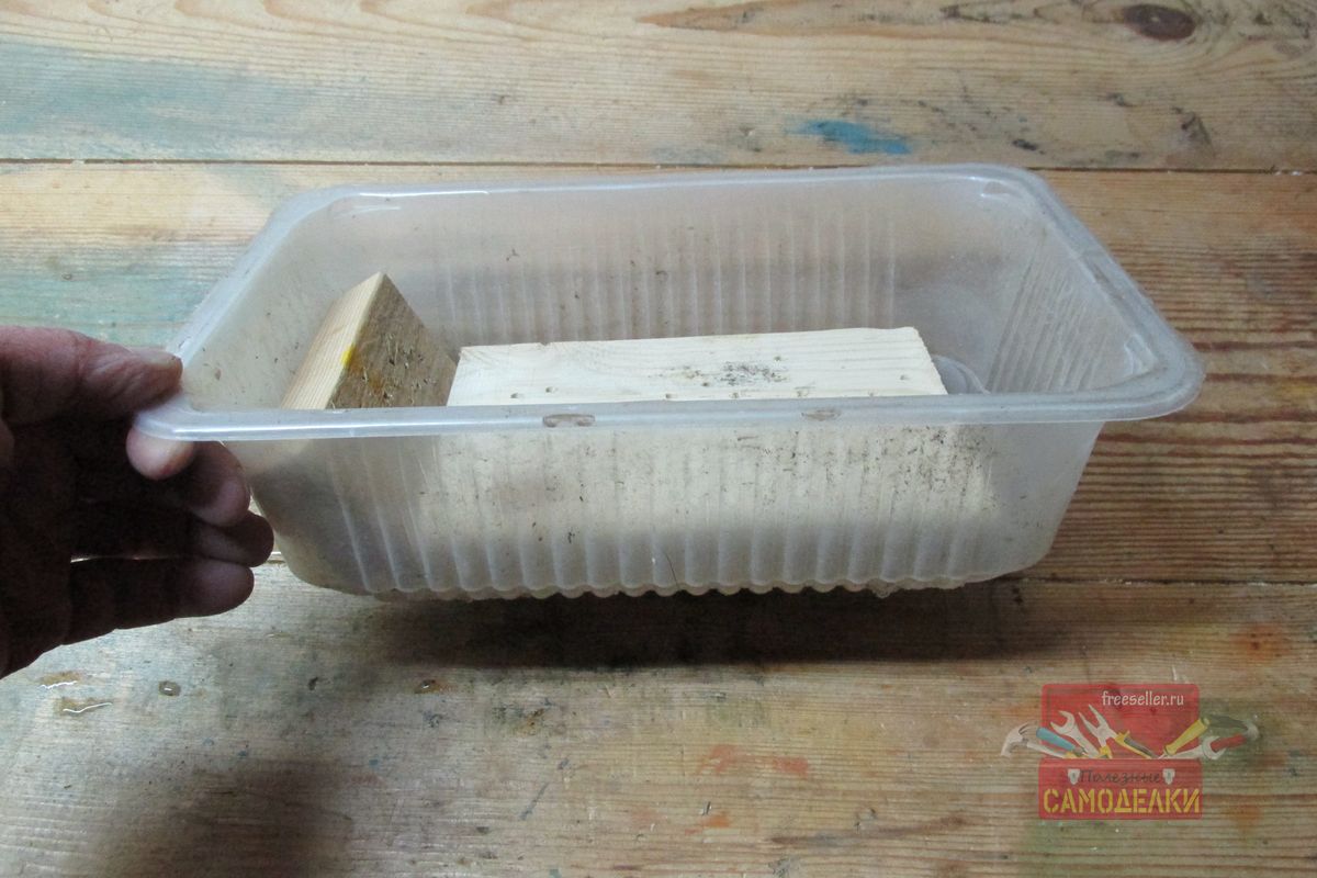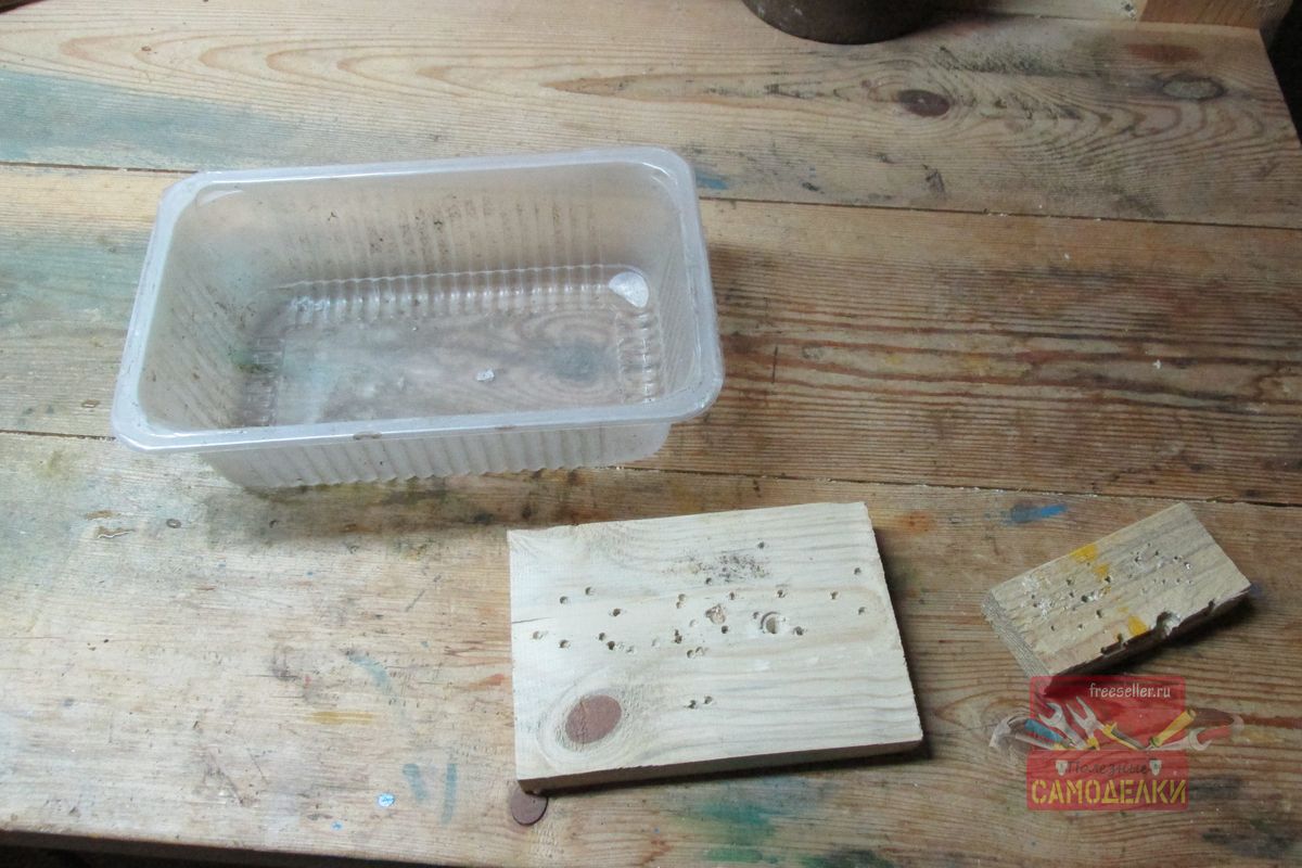 Однако этот контейнер оказался глубоковат для колеса и чтобы это исправить, я решил дополнительно применить два вот таких обрезка досок из отходов.![]()