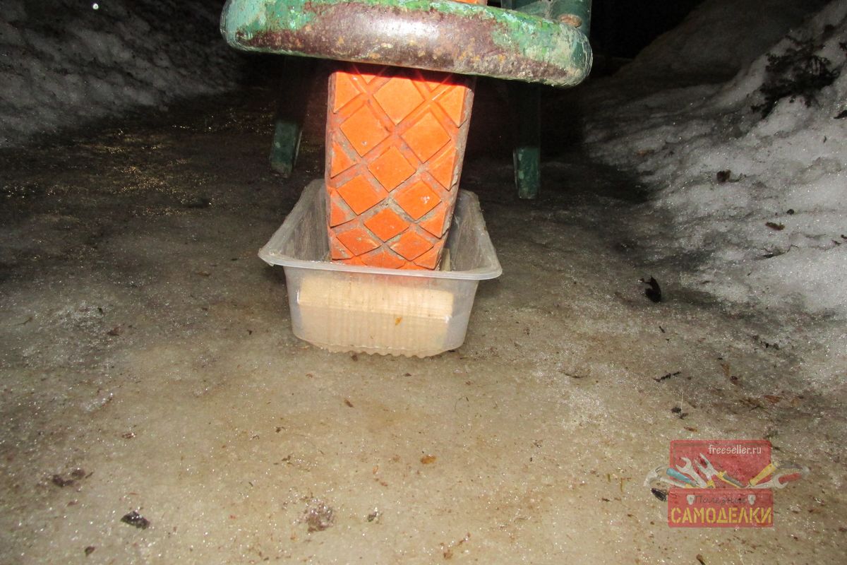 Тут-то мне и пришла идея, попробовать установить на колесо тачки, какую-нибудь лыжу. Правда времени, чтобы делать настоящую лыжу у меня не было, поэтому я решил попробовать применить в качестве лыжи подходящий пластиковый контейнер, тем более что пластик очень хорошо скользит по льду.