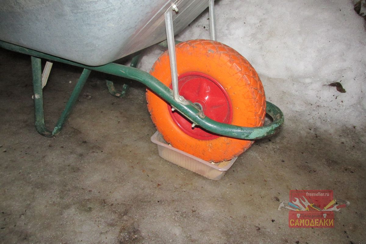 Поэтому если придется перевозить грузы на тачке в сильный гололед, легче просто временно обуть колесо в подходящий пластиковый контейнер. Кстати, если под рукой нет готового контейнера подходящего на роль лыжи, я думаю, ее вполне можно сделать из пятилитровой пластиковой бутылки или канистры разрезанной пополам.