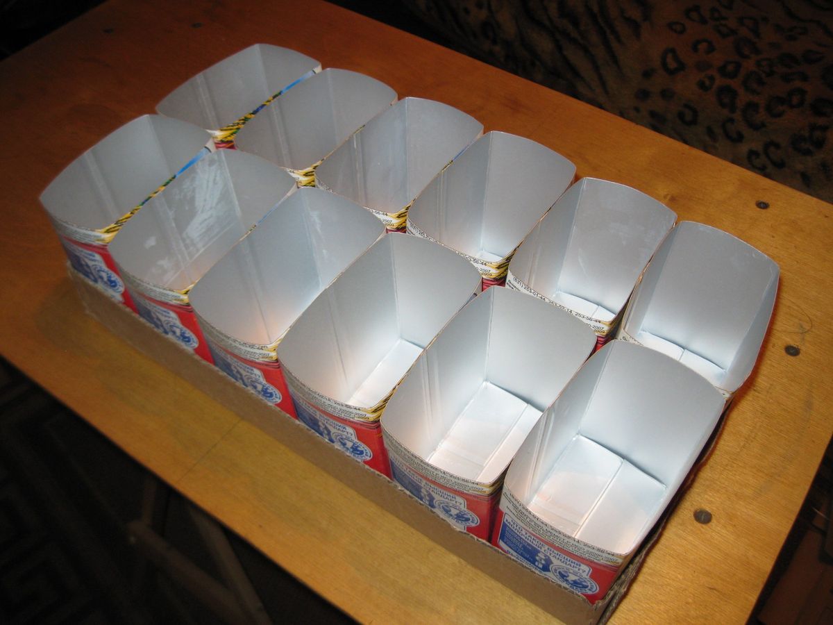 Сначала я заготовил 12 контейнеров, которые будут служить в органайзере, ячейками для пакетиков с семенами. Для этого я отрезал верхнюю часть у молочных пакетов, сформировав контейнеры высотой примерно 10 см.![]()