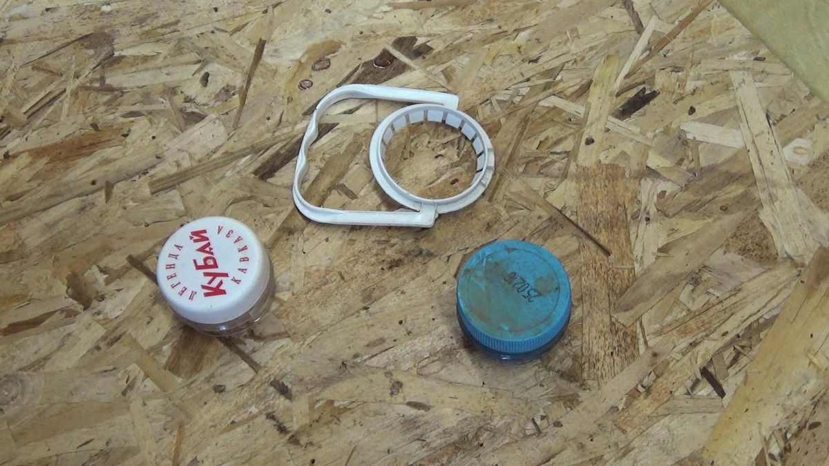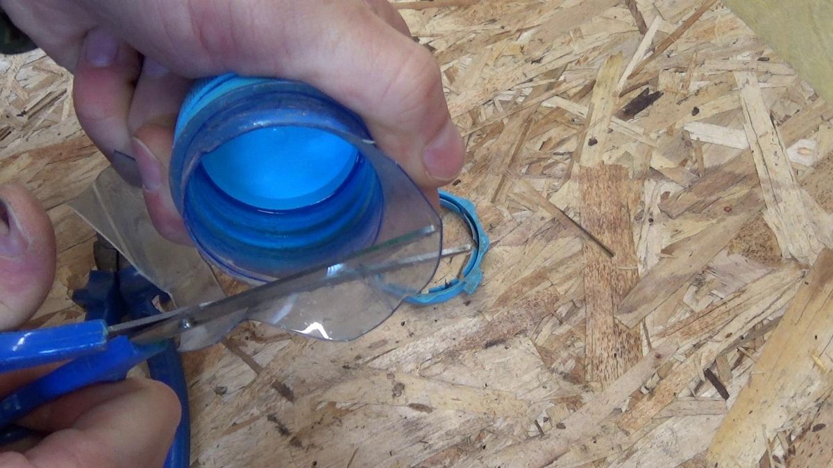 Далее берем и отрезаем от 5-и литровых пластиковых бутылок два горлышка с пробками и одной ручкой для переноски. При помощи ножниц отрезаем все лишнее, что бы осталось только горлышко без "юбки".