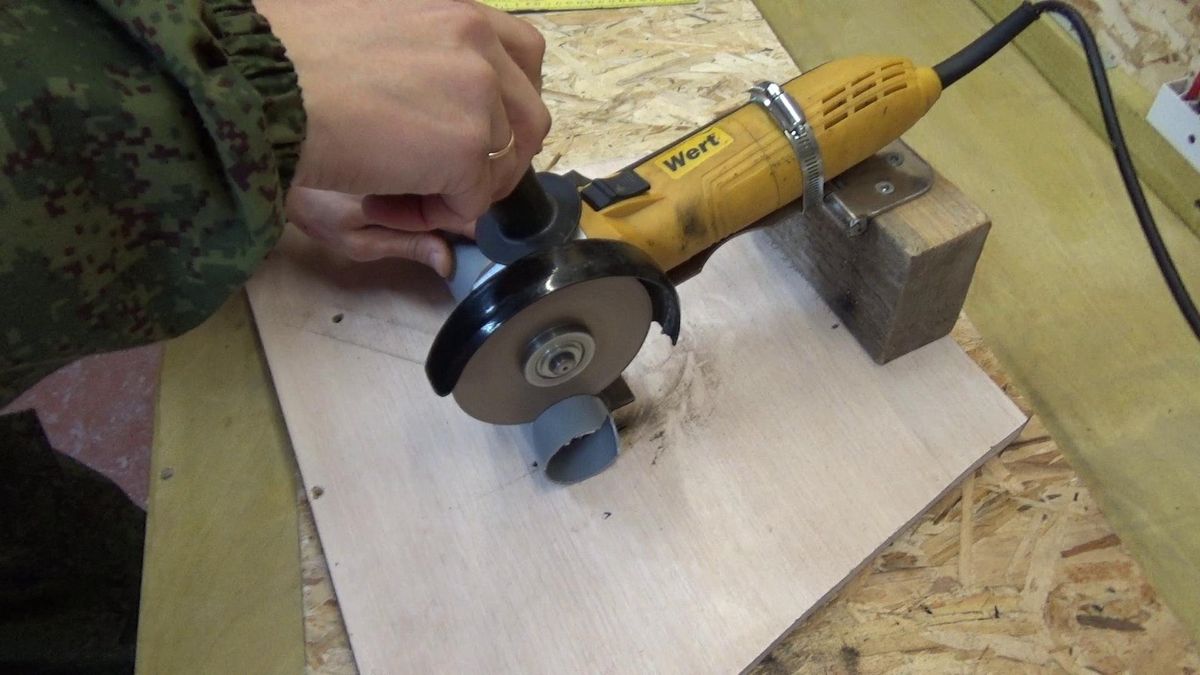 Далее при помощи самодельного станка для УШМ отрезаем лишнюю часть. Как сделать такой станок, я показывал в одной из прошлых статей. При помощи данного станка очень просто отрезать под прямым углом. И так же шлифуем все заусенцы.