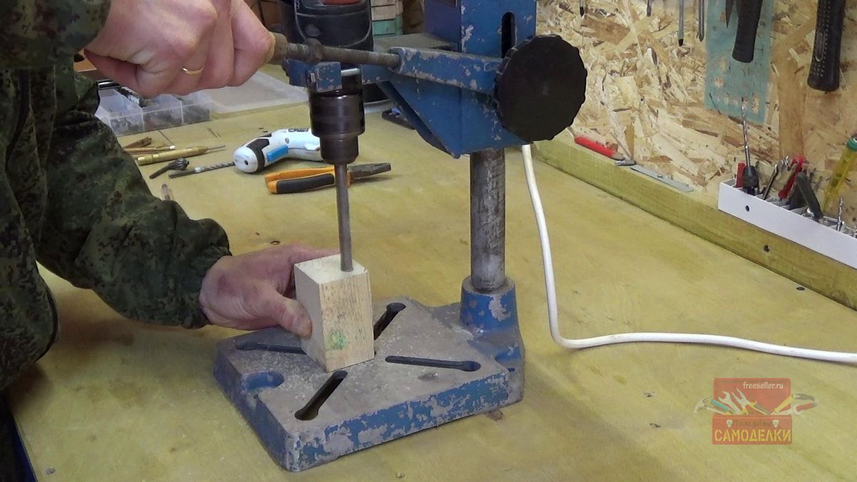 Теперь можно испытать кондуктор. Ставим его на кусок ДСП, прижимаем струбциной и можно сверлить отверстия.