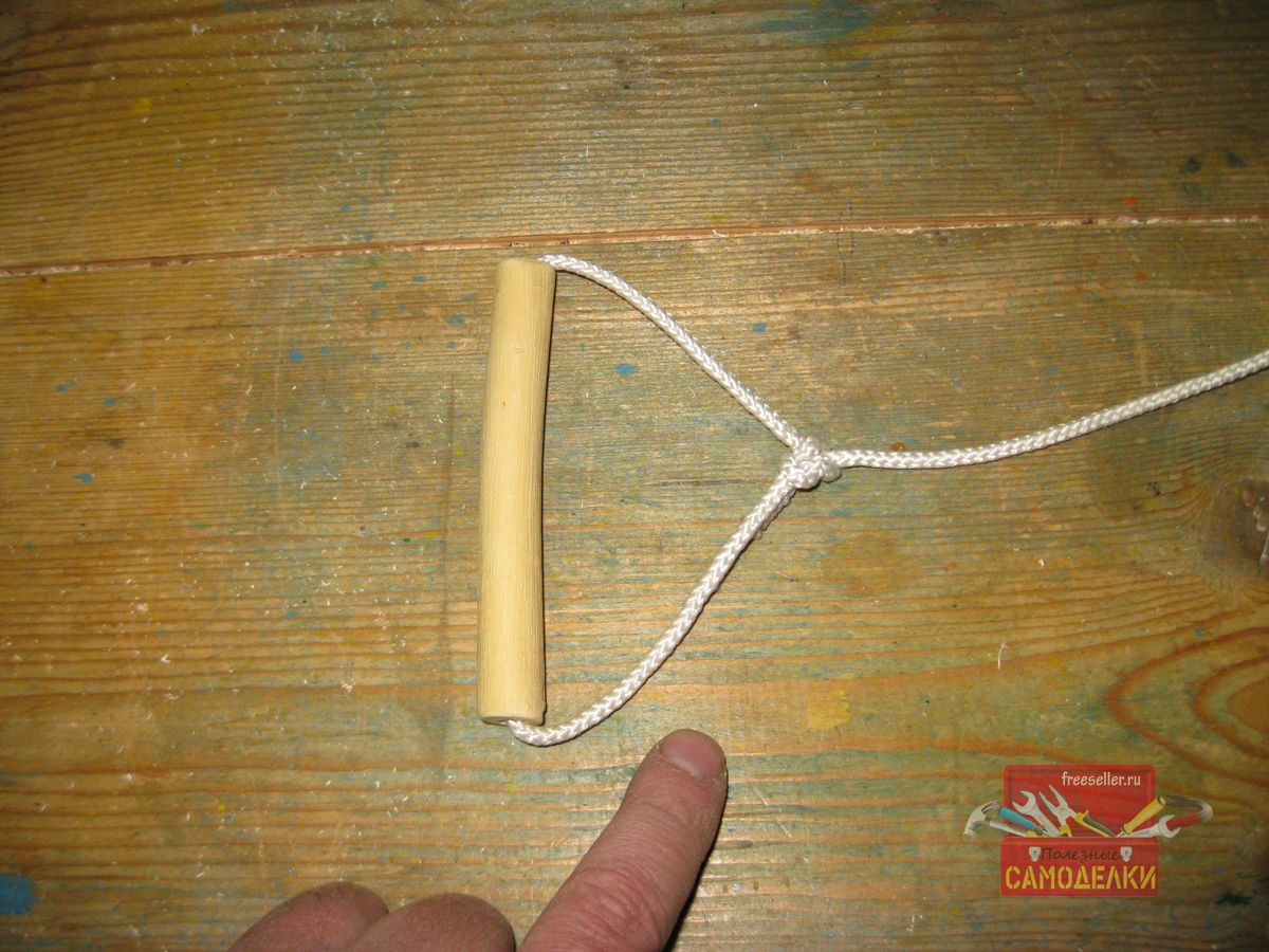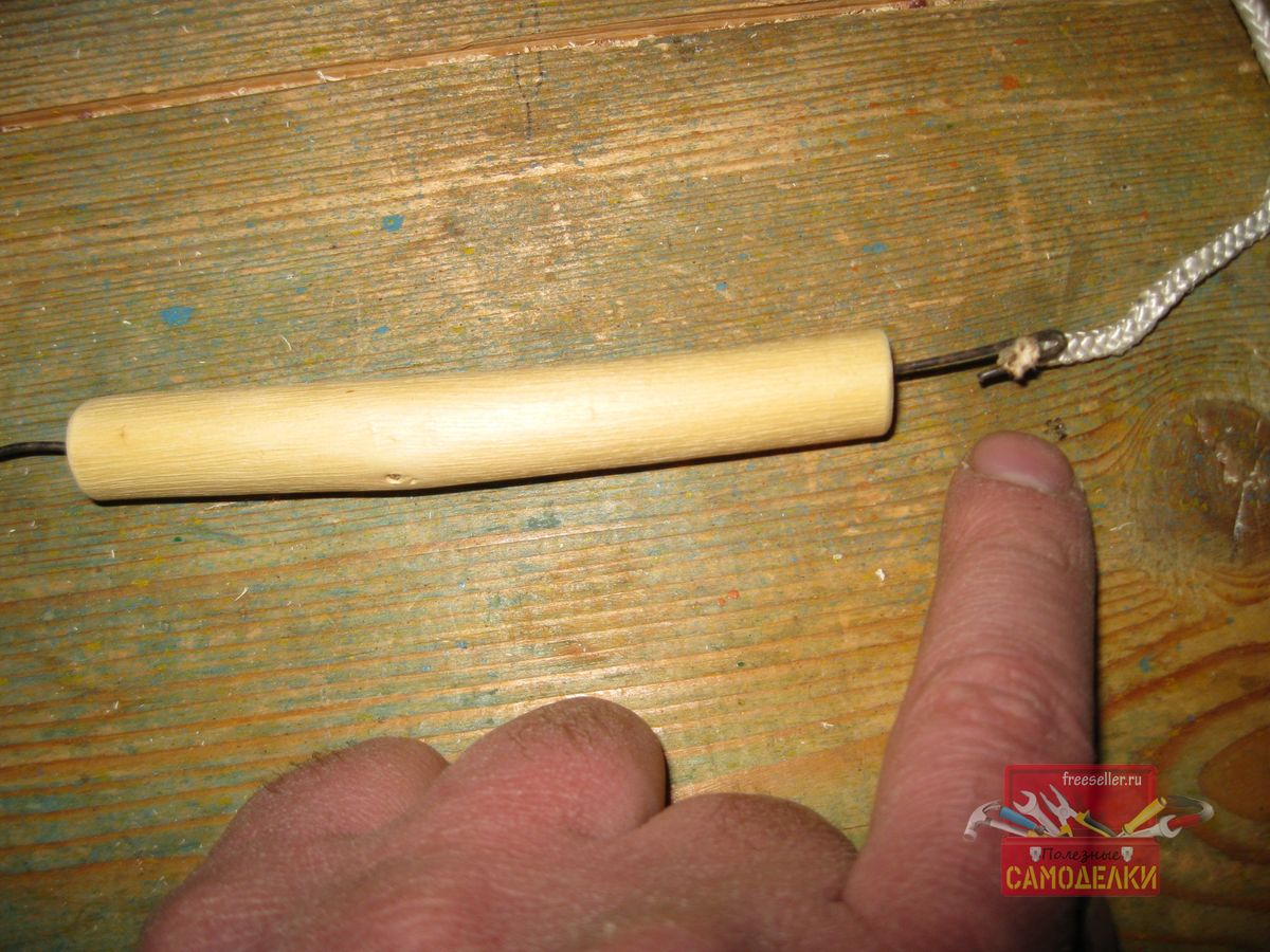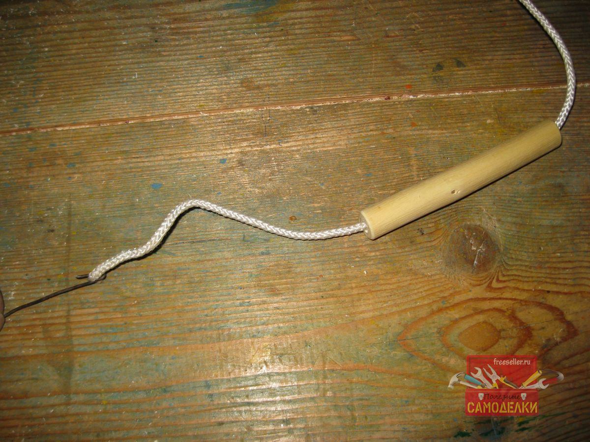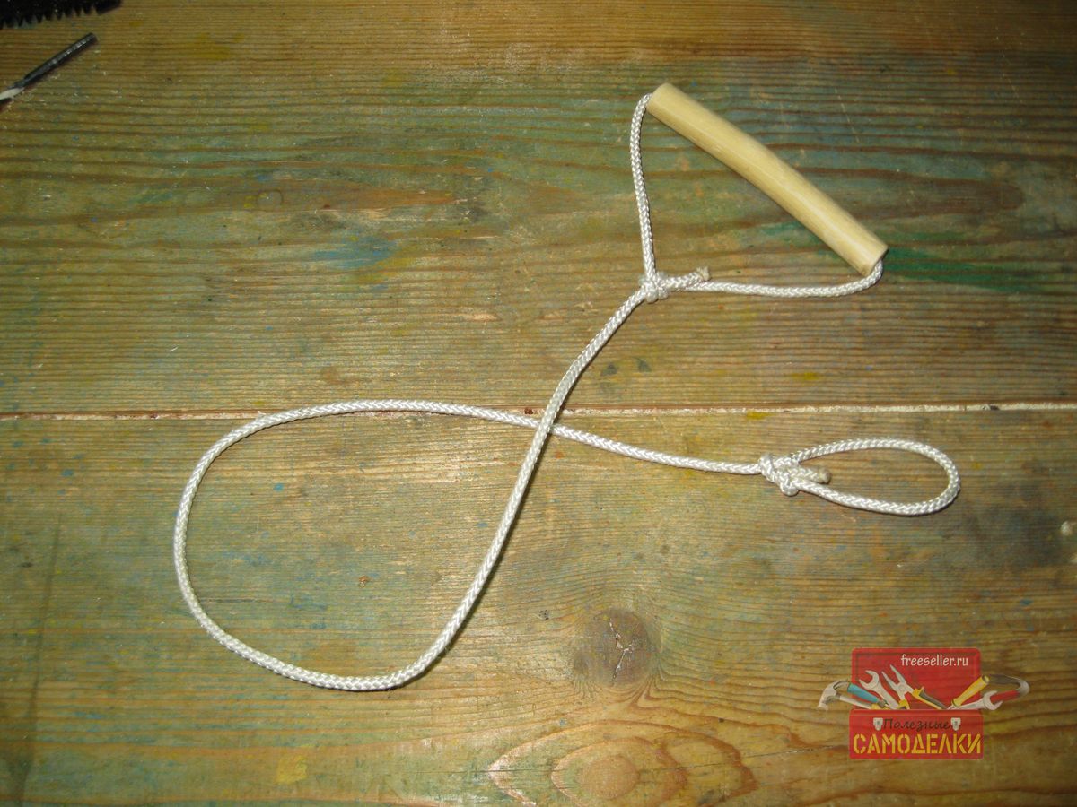 И продел сквозь нее веревку, используя при этом тонкую стальную проволоку. Один конец веревки, я зажал в петле проволоки и таким образом, протащил ее через отверстие деревянной ручки.