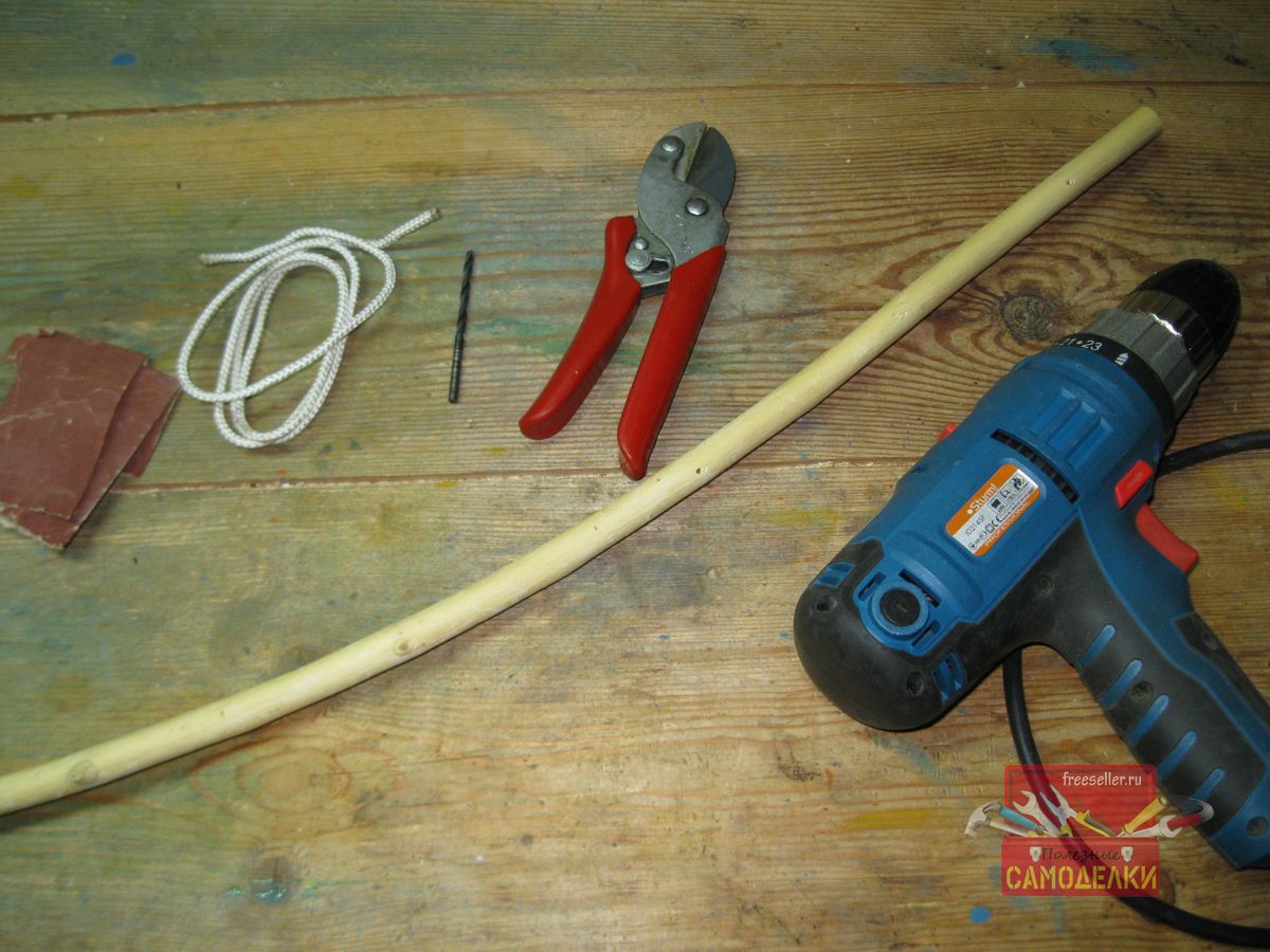 Сначала я отрезал от ветки при помощи секатора, вот такой кусок длиной 10-12 см. Он будет играть роль деревянной ручки, одетой на веревку, чтобы веревка не резала руку.