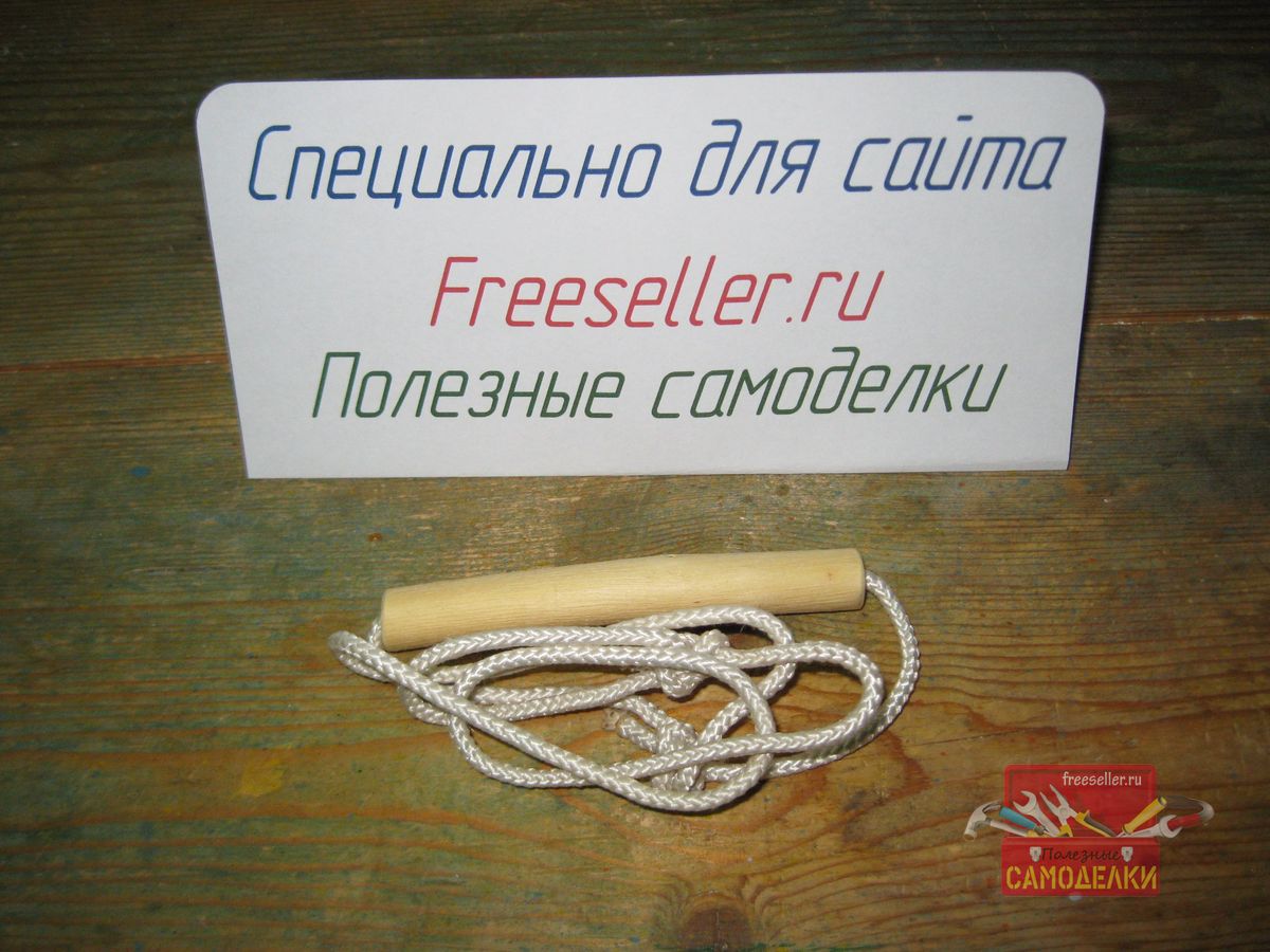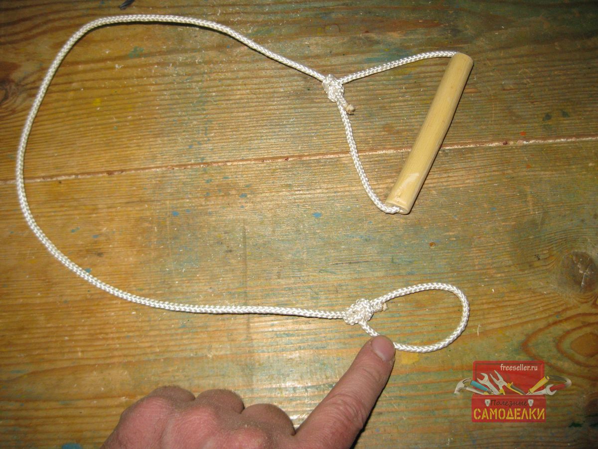 Очень важно, на мой взгляд, правильно подобрать длину веревочной рукоятки. Если сделать ее слишком короткой, то придется низко наклоняться, а если сделать очень длинной, то рука, которой приходится держать эту рукоятку, будет все время согнута в локте, что приведет к ее быстрой утомляемости. Поэтому желательно выбирать такую длину рукоятки, чтобы держащая ее рука, в самом нижнем положении, была почти полностью разогнута в локте.
