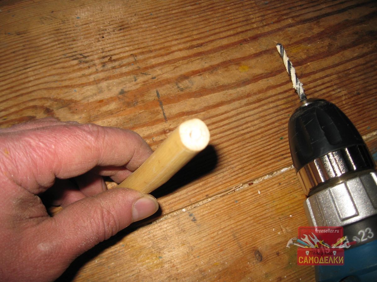 После этого, при помощи сверла диаметром 4 мм, я просверлил в отрезке ветки, сквозное отверстие. Для этого я сверлил отрезок с обеих сторон.