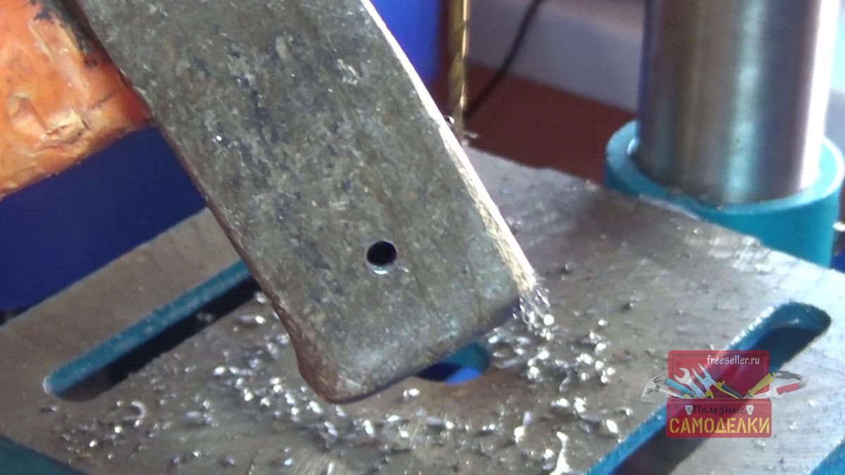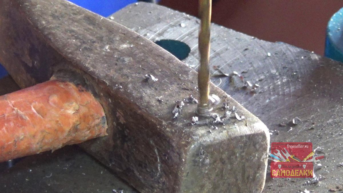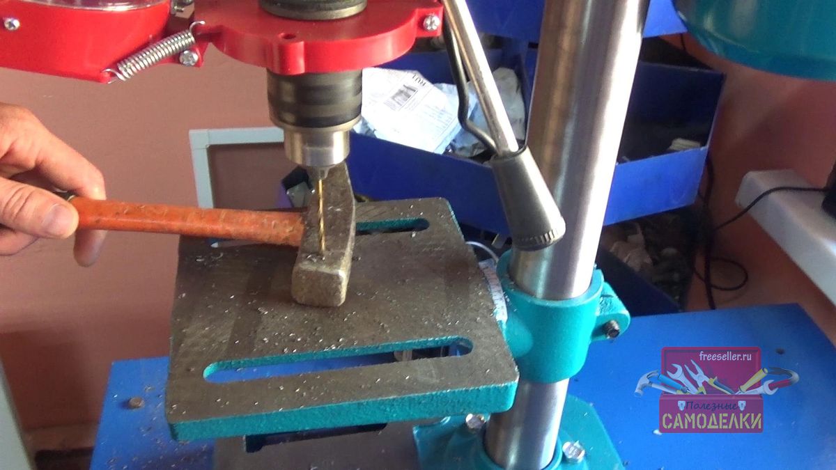 Далее в отмеченном месте сверлим отверстие. Сверлить нужно до середины молотка. Лучше всего сделать это на сверлильном станке, но если его нет, то можно и дрелью.