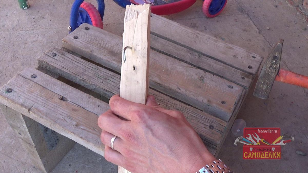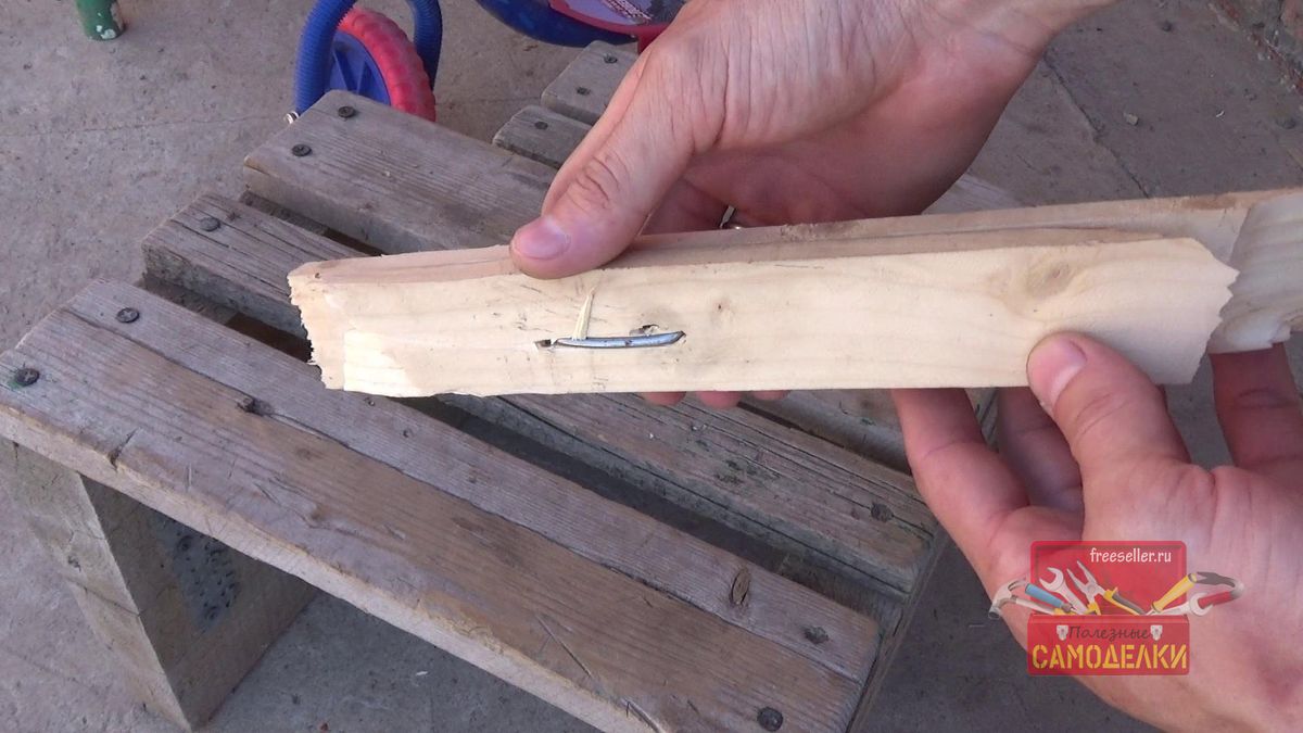 Теперь можно испытать доработанный молоток. Забиваем гвоздь через две доски, затем одеваем кончик гвоздя на молоток, в то отверстие, которое ранее просверлили и загибаем кончик.