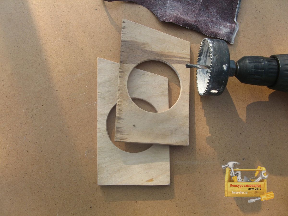 Две заготовки нужны для поддержки крыши. В них коронкой по дереву проделываю два отверстия. Так птичкам удобно сидеть. Все заготовки шлифую наждачной бумагой.