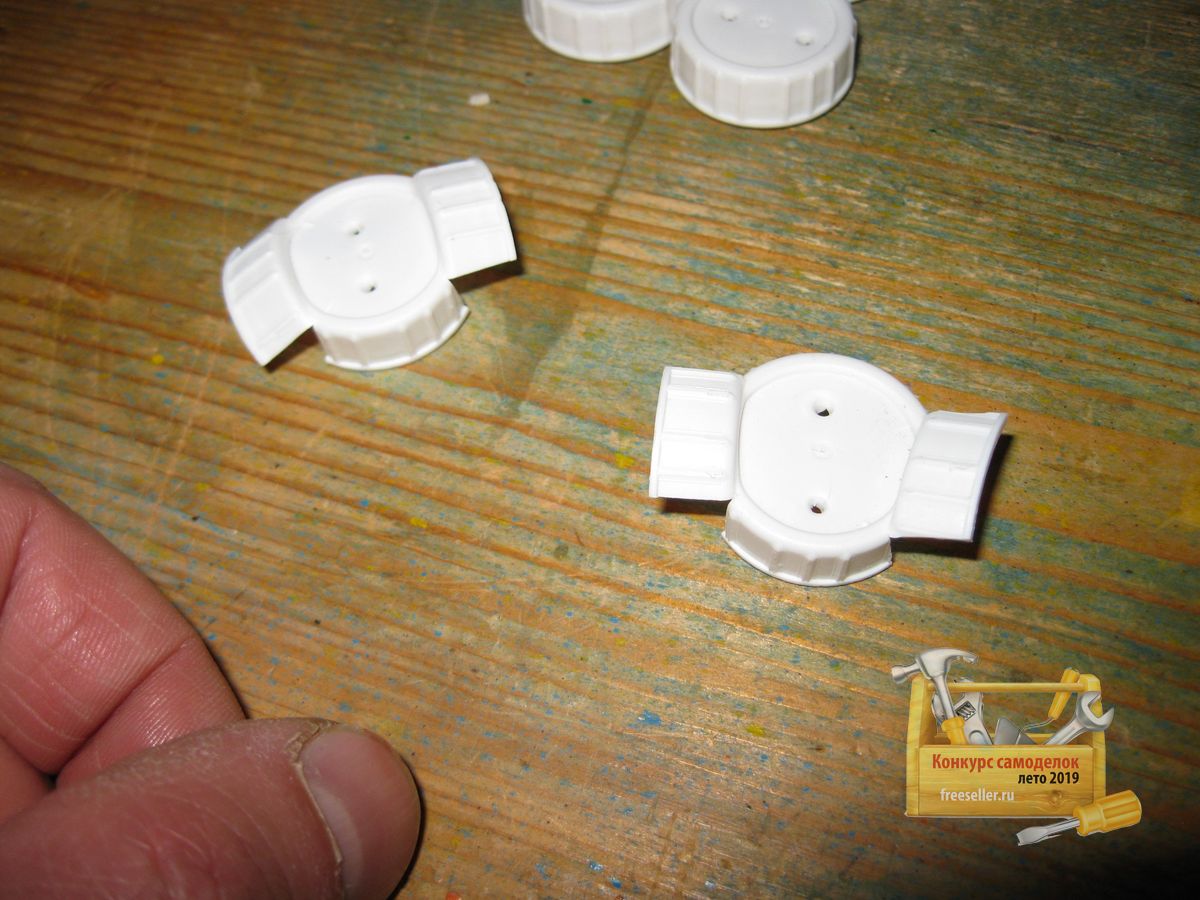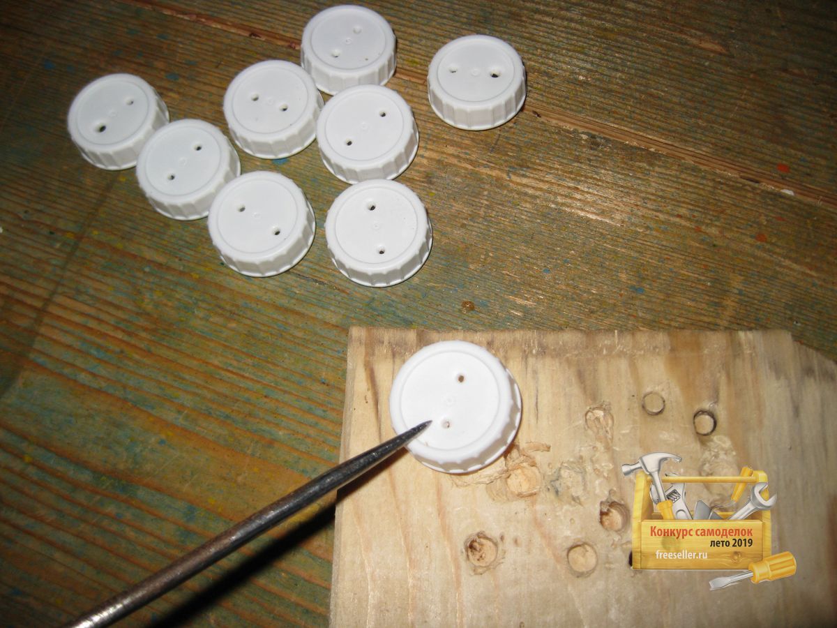 Для этого, я сначала при помощи шила, проколол в каждой крышке по два отверстия.