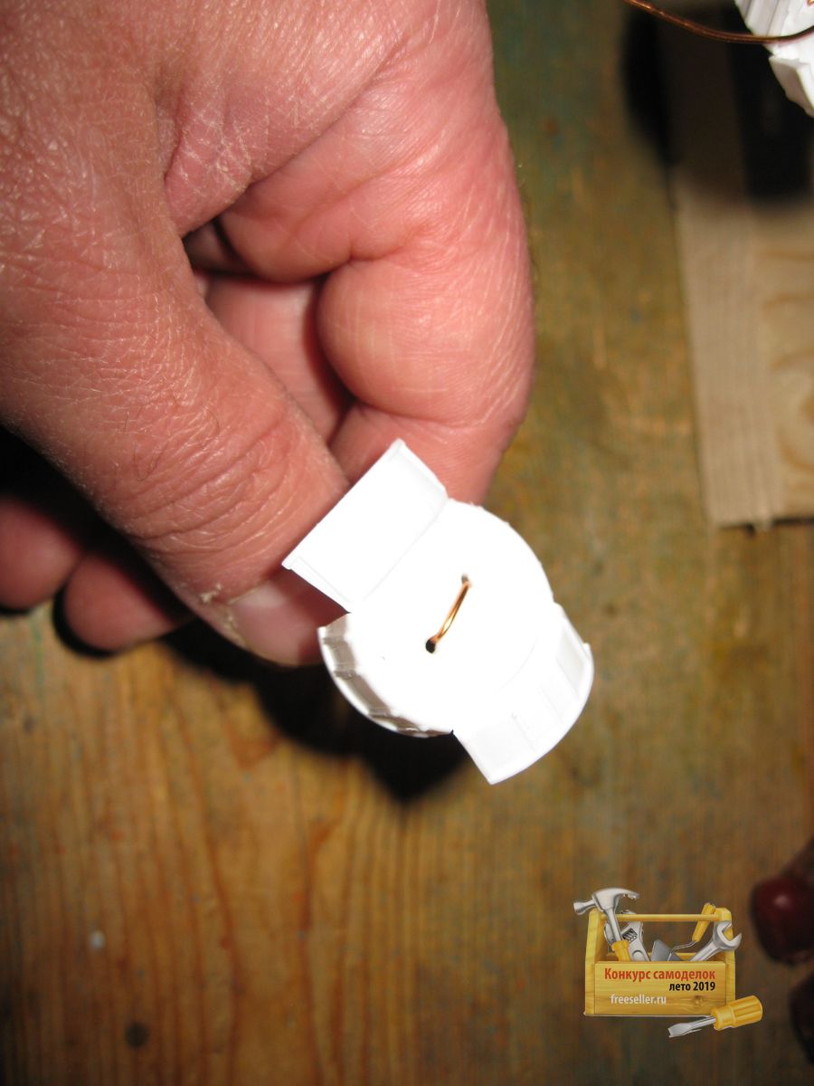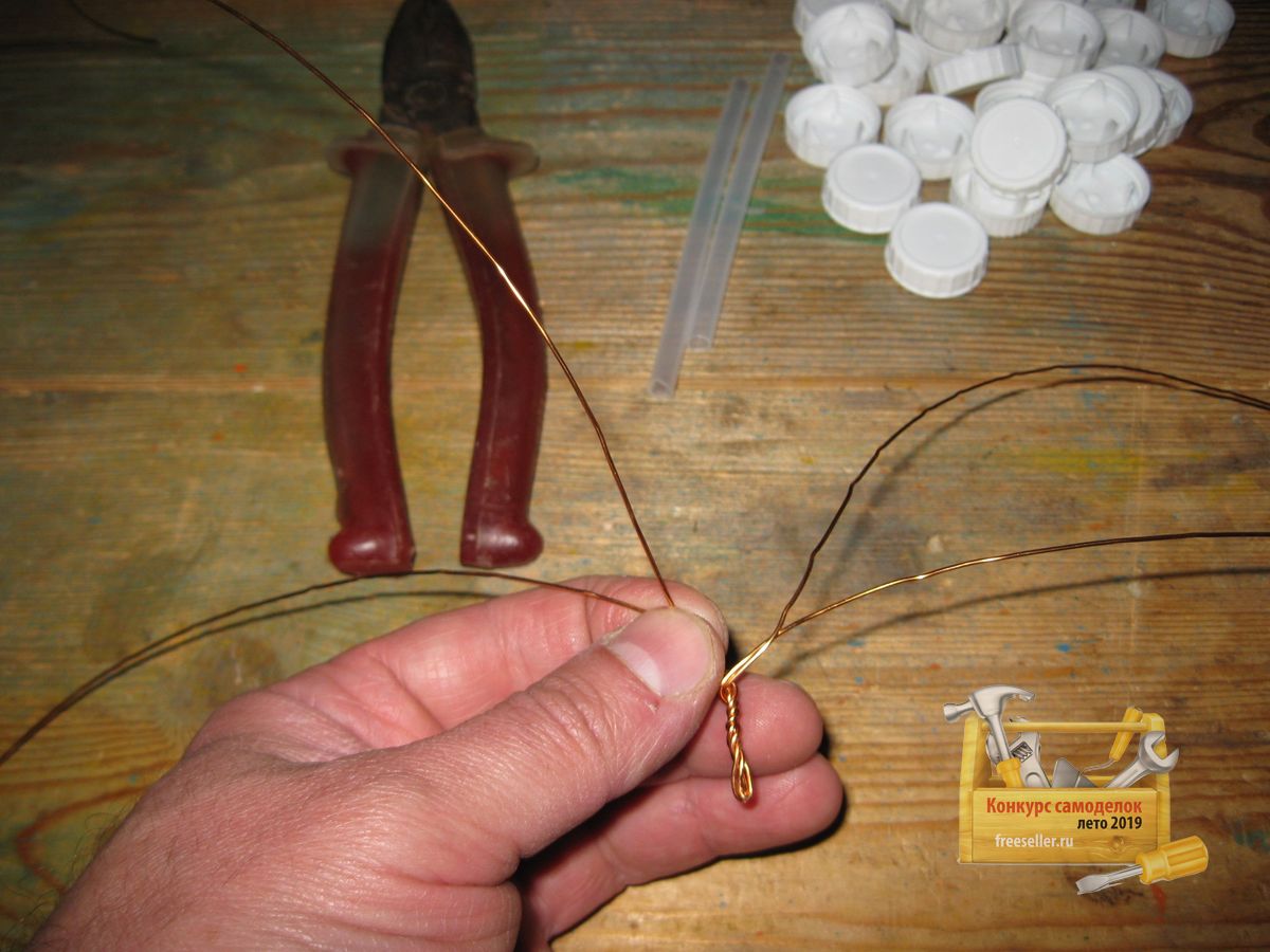После этого, я закрепил каждую крышку на конце медной проволочки, сначала просунув кончик проволоки в отверстия в крышке, а снизу скрутив ее пассатижами.