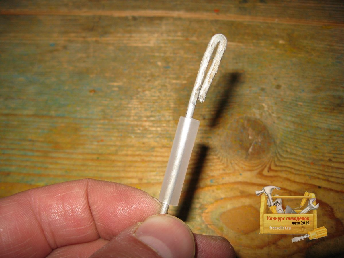 А затем приложив к загнутой части проволоки, скрученное основание медных проволочек, плотно надел на них отрезок пластиковой трубки.