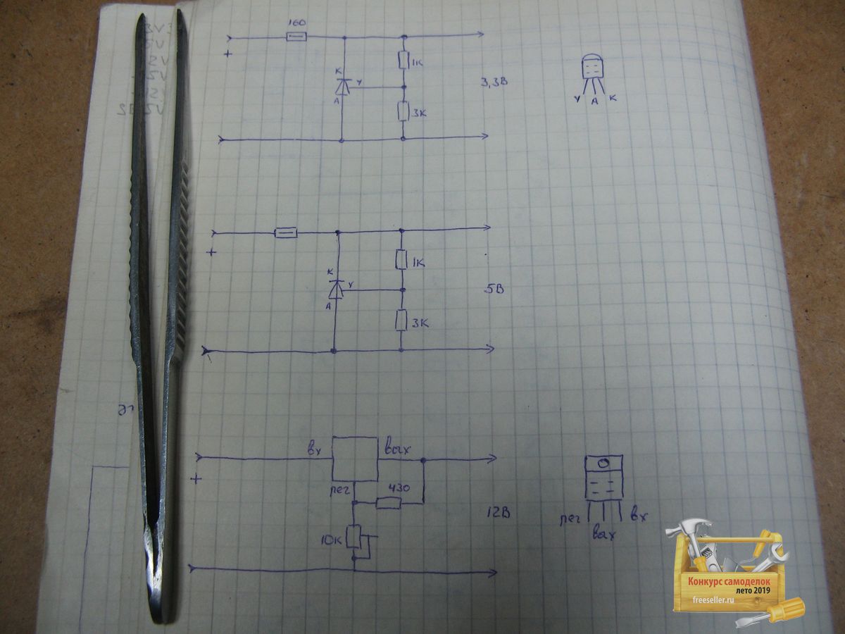 Нам нужно обойти контроль выходных напряжений. Для этого нужно собрать три стабилизатора на основные напряжения. Номиналы резисторов рассчитаны в калькуляторе, который можно найти в сети.