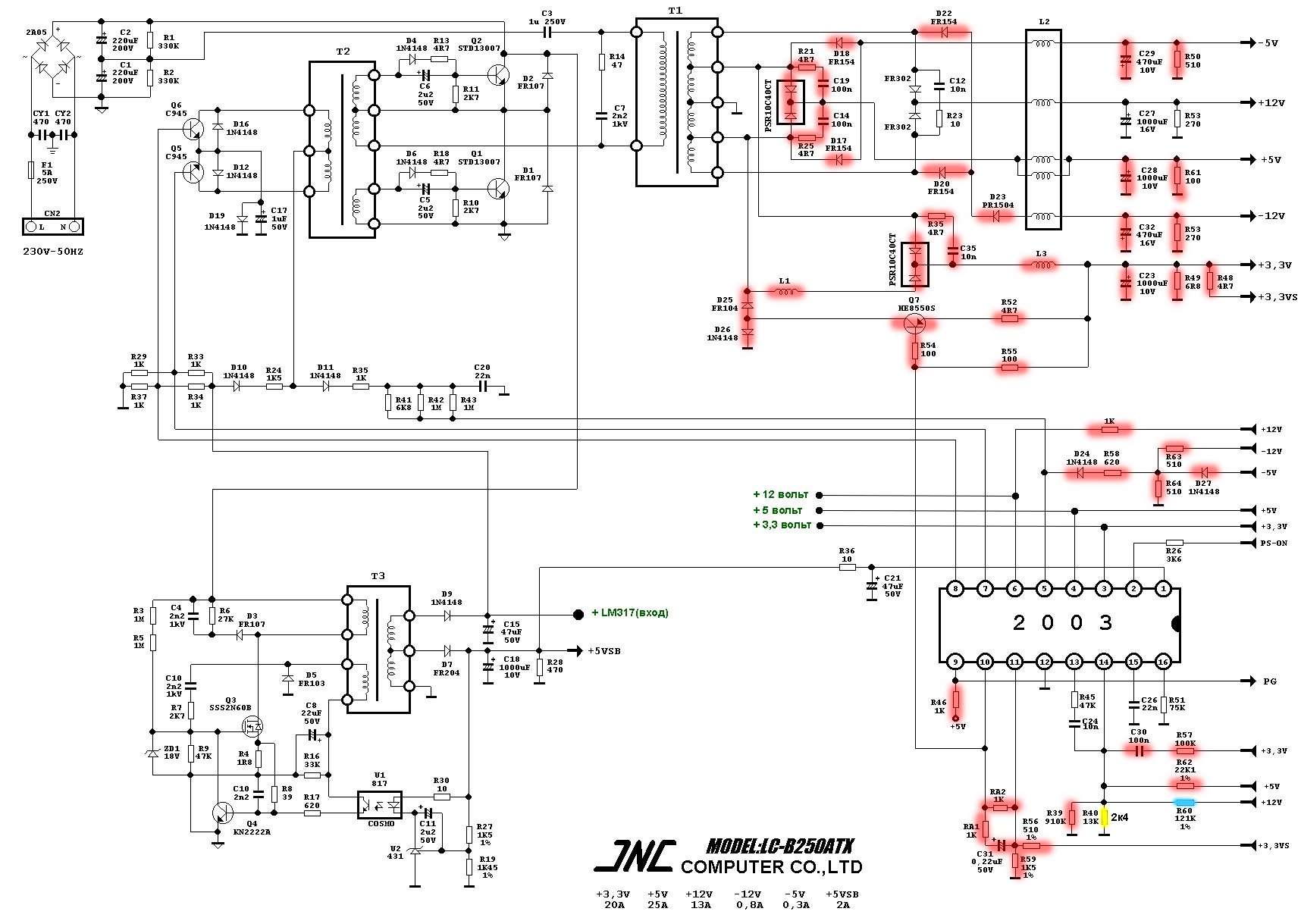 Распаиваем провода по измененной схеме. Зеленым маркером указаны точки, куда будут припаяны стабилизаторы. Два верхних стабилизатора припаиваем к выходу третьего. Выхода верхних стабилизаторов, и выход нижнего распаиваем на указанные точки: +3,3; +5; +12 вольт.