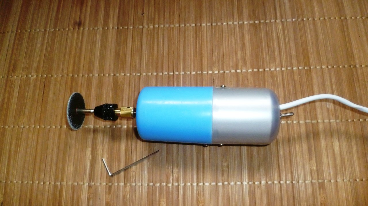 Почти бесплатный легкий, небольшой и очень удобный электроинструмент для начинающего самодельщика. Универсальность применения с большим выбором насадок. Вполне достаточная мощность. Единственная покупная деталь-трехкулачковый патрон с переходником под вал диаметром 3,17мм фиксируется на валу двигателя двумя винтами. Патрон зажимает инструмент до 3,5мм.