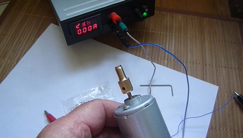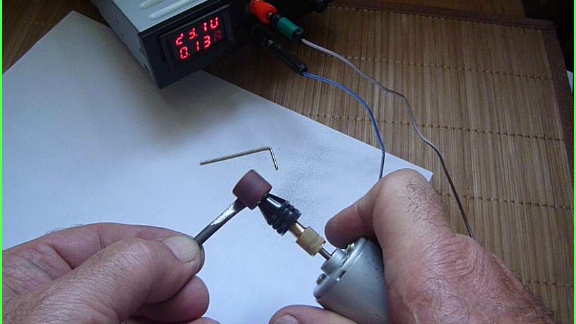 Двигатель на 24 вольта запитывается от любого источника питания до 24В. Присутствие регулировки напряжения дает возможность изменения оборотов двигателя мини дрели.