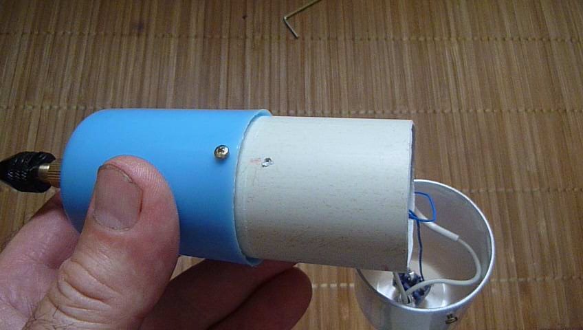 Корпусом служит пластиковая труба, крышки из колпачков дезодоранта.В задней крышке установлен тумблер питания.