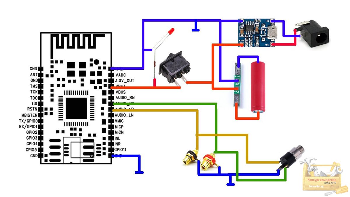Пару слов о схеме. Есть модуль, Bluetooth. Питаем его от аккумулятора, через выключатель. Заряжается аккумулятор через контроллер заряда. Выход с модуля идет на разъемы «тюльпан» и jack 3.5 мм.