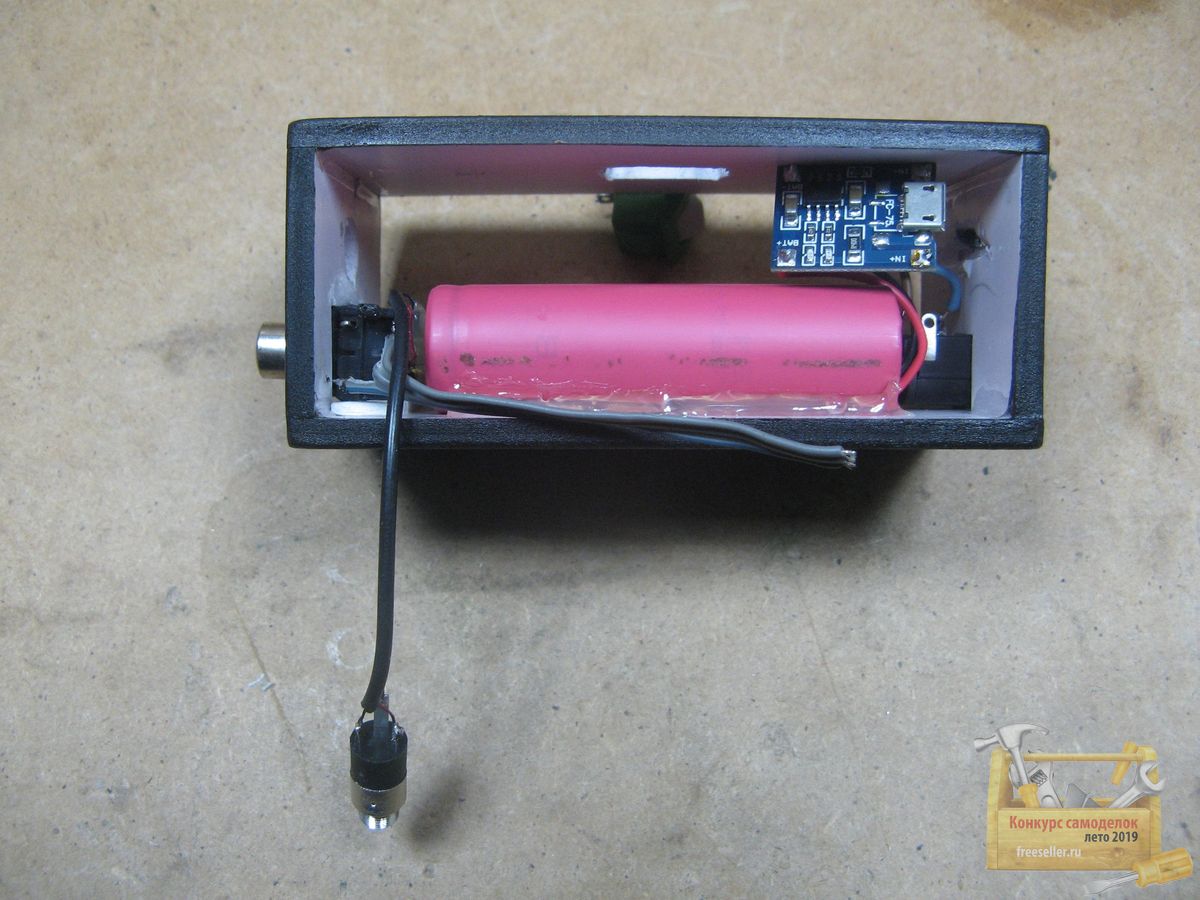 Получилась довольно компактная конструкция. Работает отлично. Фона практически нет. Аккумулятор так и не разрядил, очень на долго его хватает. Теперь можно свободно проигрывать музыку без проводов.