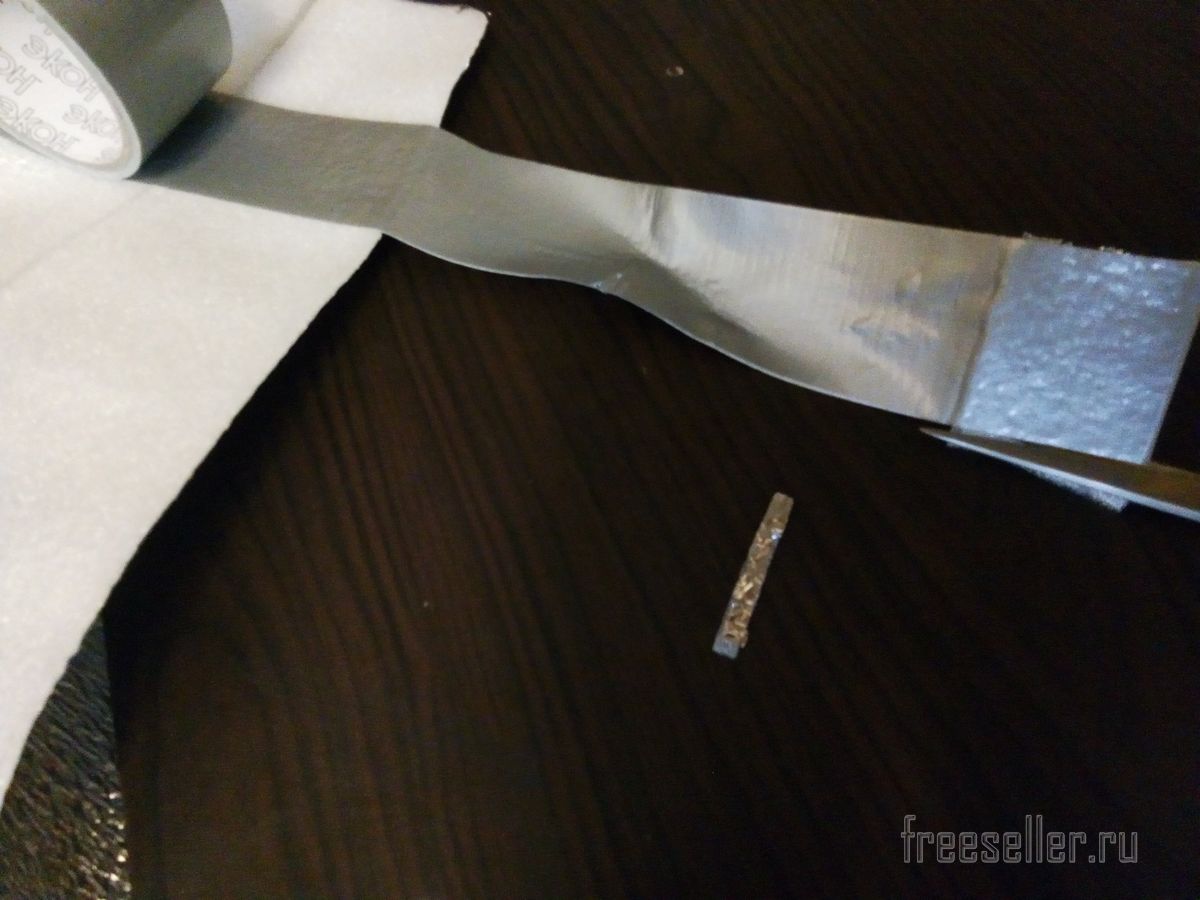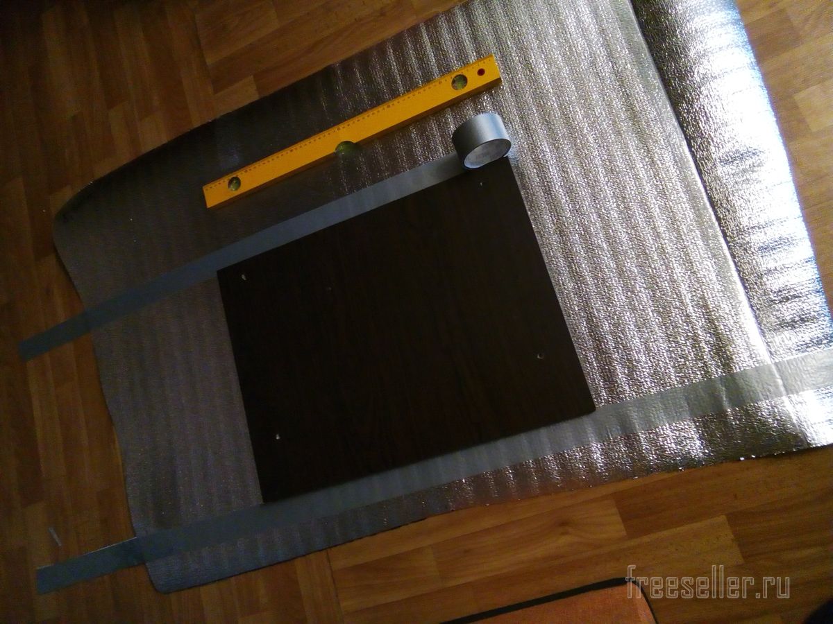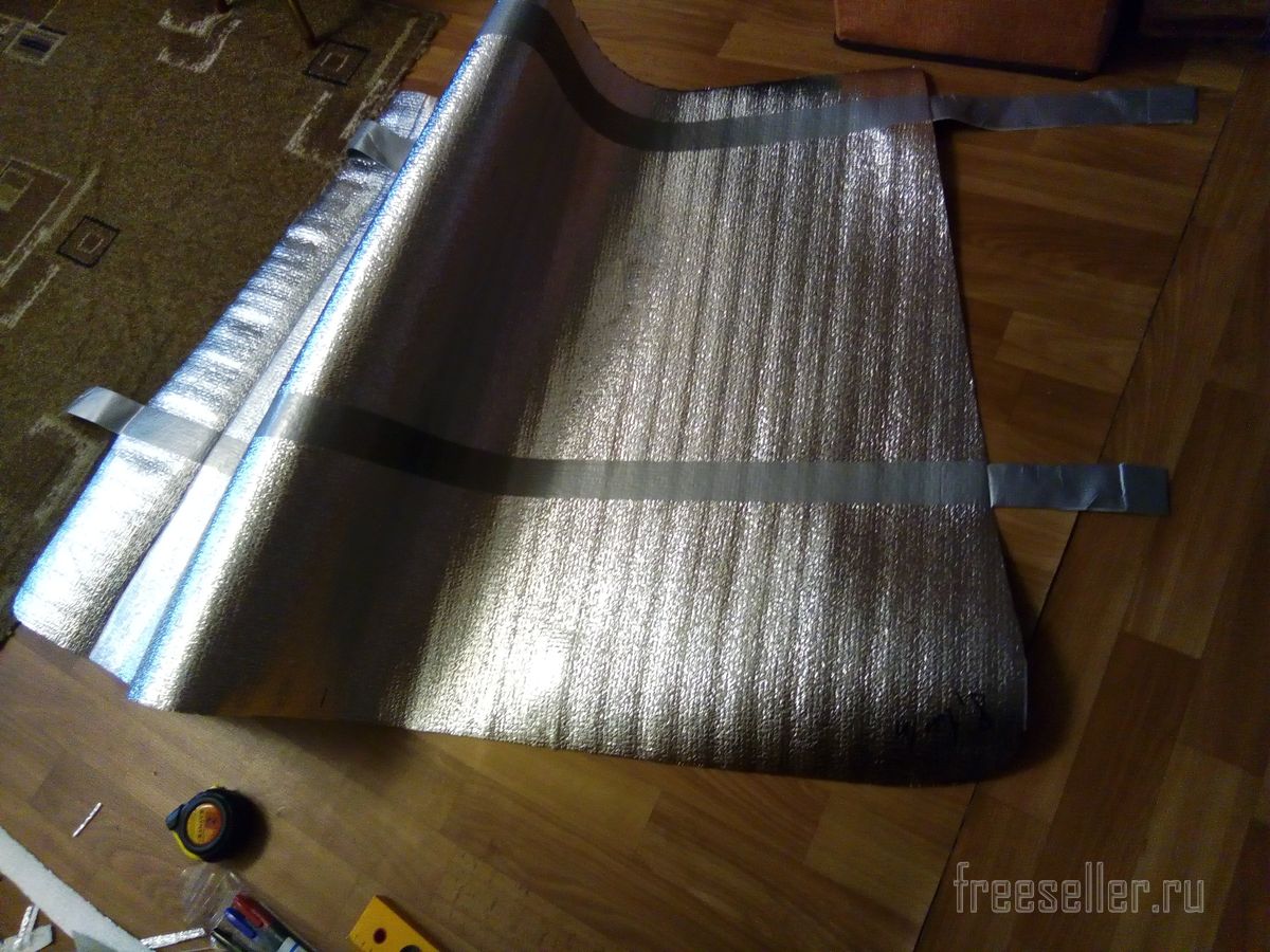 Вырезаем по контуру и делаем "уши". По краям "ушей" вклеиваем квадратики из того же утеплителя. Получился сэндвич из скотча и фольгоизола.