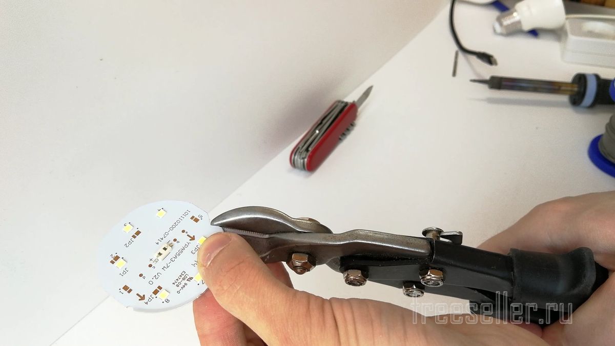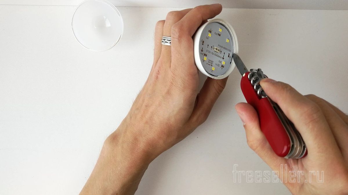 Отсоединю пластиковый рассеиватель от лампочки. Нужно вынять плату со светодиодами. По периметру плата приклеена герметиком, его нужно немного подрезать ножом.