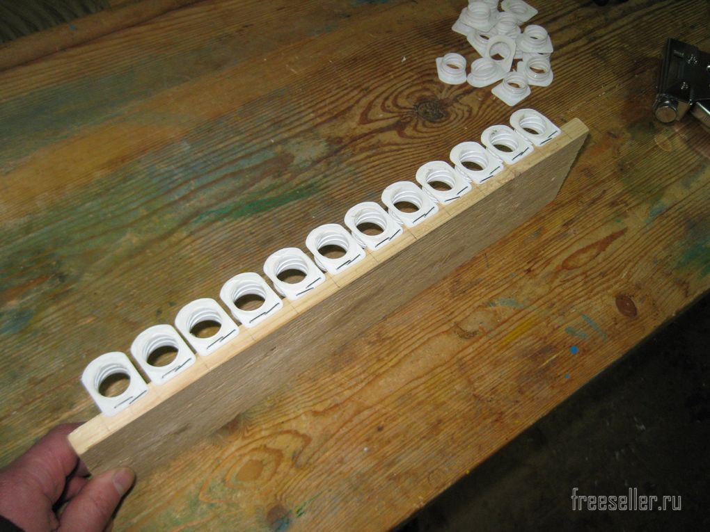 Затем произвел разметку верхней и нижней узких сторон дощечки под пластиковые резьбовые основания. Поскольку у меня 12 резцов, то, соответственно, мне понадобится сверху и снизу дощечки прикрепить по 12 резьбовых оснований.