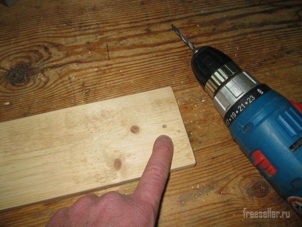 Сначала с обеих сторон дощечки, я просверлил отверстия диаметром 4 мм, под шурупы для крепления будущего держателя к стене.